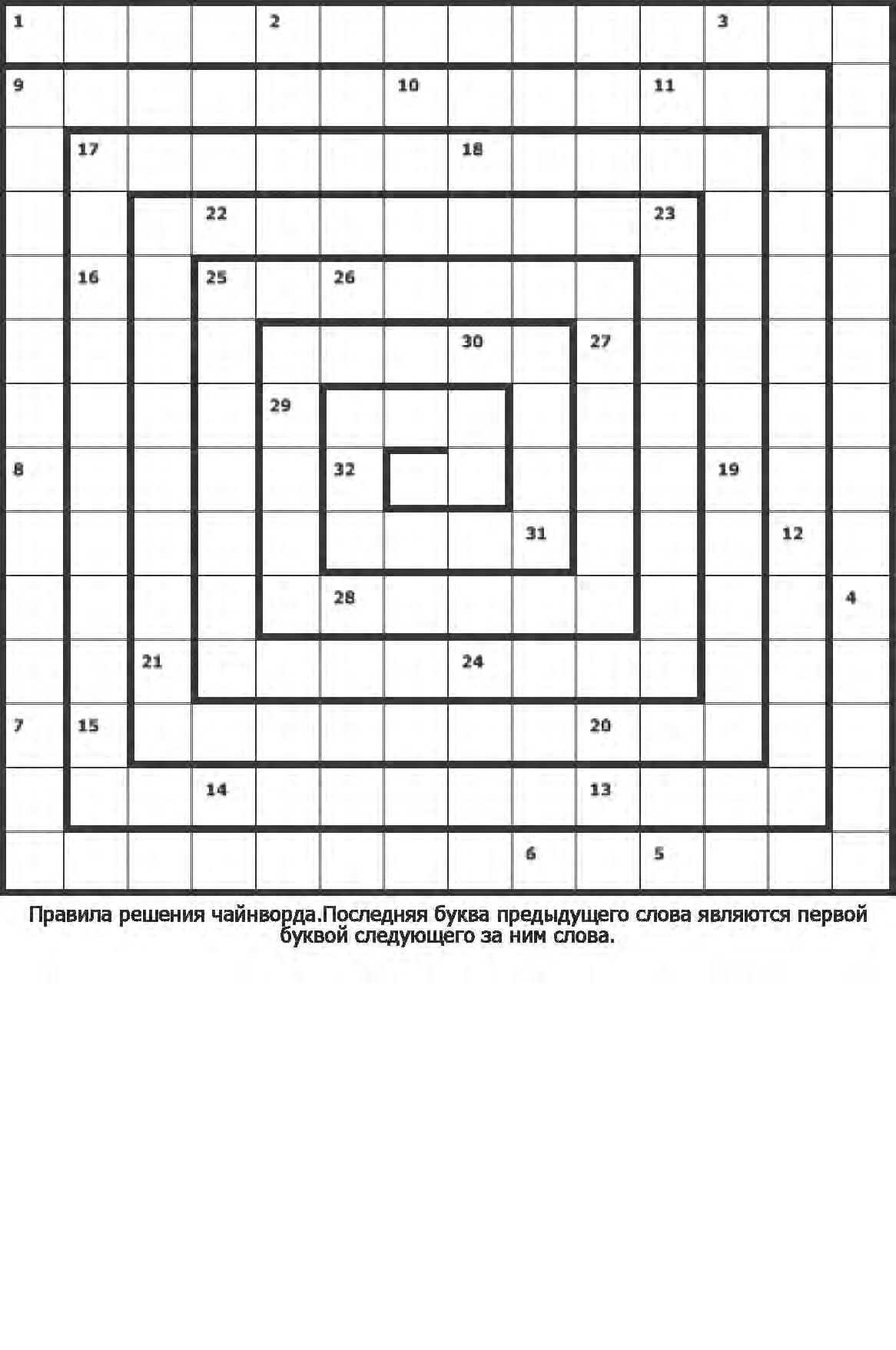 Ïðàâèëà ðåøåíèÿ êðîññâîðäà - öåïî÷êè.Êàæäîå ñëîâî èìååò 6 áóêâ â äëèíó. Êàæäîå ïîñëåäóþùåå ñëîâî íà÷èíàåòñÿ íà áóêâó, íà êîòîðóþ çàêàí÷èâàåòñÿ ïðåäûäóùåå. 1.Ðåêà. Èðàê, Ñèðèÿ. 2.Ñâîä ïðàâèë èóäàèçìà. 3.Ñâèäåòåëüñòâî îá îêîí÷àíèè ó÷åáíîãî çàâåäåíèÿ. 4.Øòàò è ãîðîä â Èíäèè. 5.Ñîëîìà íà êîðíþ ïîñëå óáîðêè óðîæàÿ. 6.Õèùíàÿ ïòèöà. 7.Òðóäíîïðåîäîëèìîå ïðåïÿòñòâèå. 8.Êîìïåíñàöèÿ çà èñïîëüçîâàíèå èçîáðåòåíèé. 9.Òèòóë ïðèíöåâ â Èñïàíèè è Ïîðòóãàëèè. 10.Êðóïíåéøàÿ ïðîìûøëåííàÿ êîðïîðàöèÿ, ßïîíèÿ, ýëåêòðîíèêà. 11. ãðå÷åñêîé ìèôîëîãèè áîãèíÿ ñïðàâåäëèâîñòè. Îòâåò íà ñòð. 42