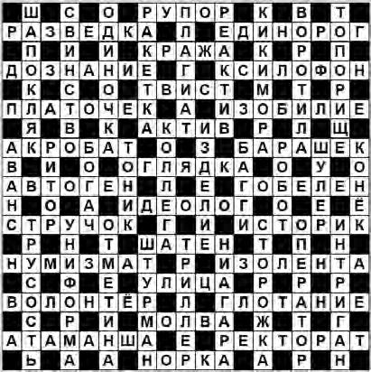 Ïî ãîðèçîíòàëè: 4. «Îðàëî» ìèòèíãóþùåãî. 10. Çàíÿòèå Øòèðëèöà. 11. Êîí¸ê-áîäóíîê. 12. Ïðèñâîåíèå ÷óæîé ñîáñòâåííîñòè ïî âñåì ïðàâèëàì êîíñïèðàöèè. 13. Ïîäõîäÿùàÿ ðàáîòà äëÿ ñëåäîâàòåëÿ. 14. Ìóçûêàëüíûå «äåðåâÿøêè». 15. Òàíåö, êîòîðîìó Áûâàëûé îáó÷àë ñ ïîìîùüþ îêóðêîâ. 16. Ñèíåíüêèé ñêðîìíÿãà, ïàäàâøèé ñ îïóùåííûõ ïëå÷. 17. Äîñòàòîê èç ðîãà. 18. «Æèâ÷èêè» â êîëëåêòèâå. 21. Öèðêà÷ «íà øàðíèðàõ». 25. Óøàñòàÿ ãàéêà. 29. Âûñìàòðèâàíèå ðàçîáëà÷èòåëåé. 30. «Îãíåííûé ðåçàê». 31. Êàðòèíà, íàïèñàííàÿ íèòêàìè. 32. Òîò, êòî æèâ¸ò ïî ïðèíöèïó: íå äåëàé êàê ÿ äåëàþ, à äåëàé êàê ÿ ãîâîðþ. 33. Óïàêîâêà äëÿ ãîðîøèí. 37. Ó÷¸íûé, äûøàùèé ïûëüþ âåêîâ. 41. «Ðûæèé, ðûæèé, êîíîïàòûé» ïî öâåòó âîëîñ. 44. Êòî òðàòèò íîâûå äåíüãè íà ïðèîáðåòåíèå ñòàðûõ? 45. Ýëåêòðîòåõíè÷åñêèé àíàëîã ìåäèöèíñêîãî ïëàñòûðÿ. 46. Äîìà â äâå øåðåíãè. 47. Èìïîðòíûé äîáðîâîëåö. 48. Îòïðàâëåíèå â æåëóäîê. 49. Íàðîäíàÿ ñïëåòíèöà. 50. Ãëàâàðü øàéêè â þáêå. 51. Ãåíåðàëüíûé øòàá óíèâåðñèòåòà. 52. È âîðîòíèê øóáû, è æèëèùå òîé, èç êîòîðîé ýòà øóáà ñäåëàíà.