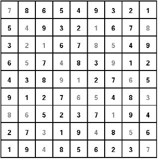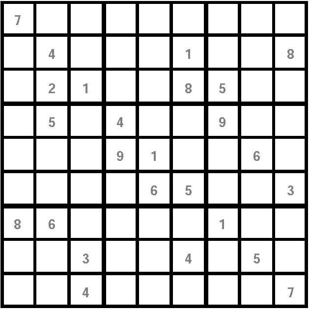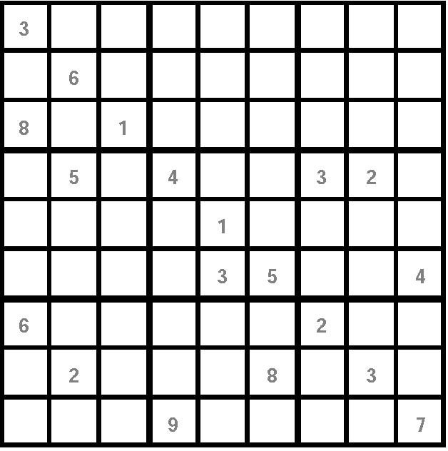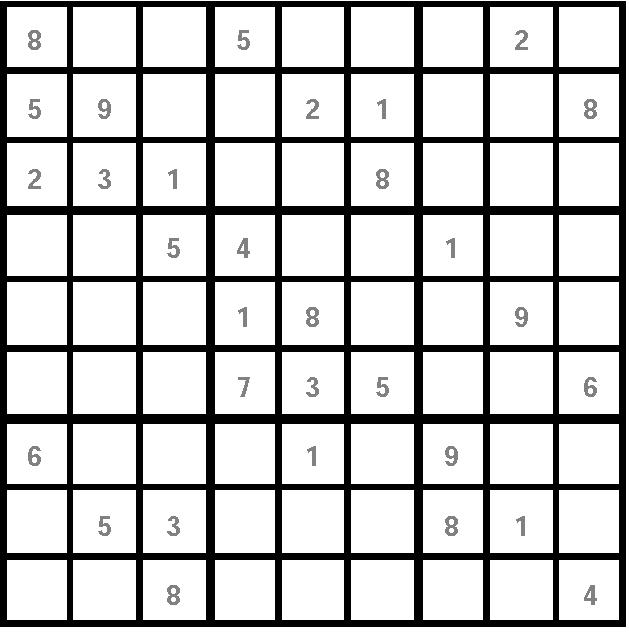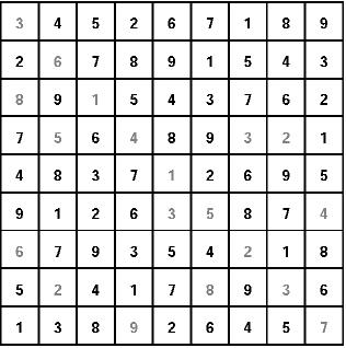 ïðåäñòàâëÿåò ñîáîé ìàòðèöó ñ ÿ÷åéêàìè 9õ9, êîòîðàÿ ðàçäåëåíà íà áîëåå ìåëêèå ñåêòîðû ðàçìåðîì 3õ3. Äëÿ ðåøåíèÿ ãîëîâîëîìêè íåîáõîäèìî, ðóêîâîäñòâóÿñü ëîãèêîé è ðàñ÷¸òîì, ïîäîáðàòü íåäîñòàþùèå öèôðû îò 1 äî 9. Ñäåëàòü ýòî íóæíî òàê, ÷òîáû êàæäàÿ öèôðà ïðèñóòñòâîâàëà, íå ïîâòîðÿÿñü, â êàæäîì ðÿäó, êàæäîé êîëîíêå è êàæäîì ñåêòîðå. Ïðàâèëüíî çàïîëíåííàÿ ìàòðèöà îçíà÷àåò: âû - ïîáåäèòåëü! Ïîìíèòå, ÷òî, ðàçãàäûâàÿ «Ñóäîêó», âû ïîëó÷àåòå âîçìîæíîñòü ñîâìåñòèòü ïðèÿòíîå ñ ïîëåçíûìíàòðåíèðîâàòü âíèìàíèå è ëîãèêó,
