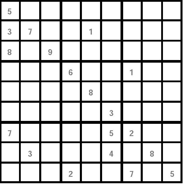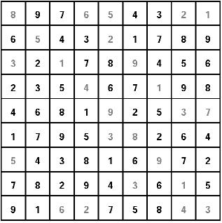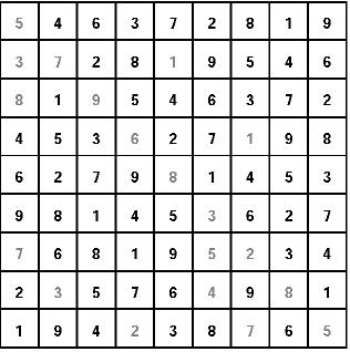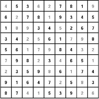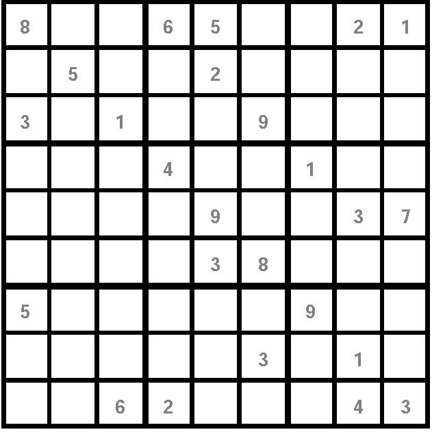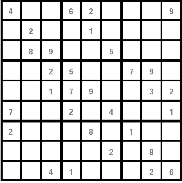 «Ñóäîêó» ïðåäñòàâëÿåò ñîáîé ìàòðèöó ñ ÿ÷åéêàìè 9õ9, êîòîðàÿ ðàçäåëåíà íà áîëåå ìåëêèå ñåêòîðû ðàçìåðîì 3õ3. Äëÿ ðåøåíèÿ ãîëîâîëîìêè íåîáõîäèìî, ðóêîâîäñòâóÿñü ëîãèêîé è ðàñ÷¸òîì, ïîäîáðàòü íåäîñòàþùèå öèôðû îò 1 äî 9. Ñäåëàòü ýòî íóæíî òàê, ÷òîáû êàæäàÿ öèôðà ïðèñóòñòâîâàëà, íå ïîâòîðÿÿñü, â êàæäîì ðÿäó, êàæäîé êîëîíêå è êàæäîì ñåêòîðå. Ïðàâèëüíî çàïîëíåííàÿ ìàòðèöà îçíà÷àåò: âû - ïîáåäèòåëü! Ïîìíèòå, ÷òî, ðàçãàäûâàÿ «Ñóäîêó», âû ïîëó÷àåòå âîçìîæíîñòü ñîâìåñòèòü ïðèÿòíîå ñ ïîëåçíûìíàòðåíèðîâàòü âíèìàíèå è ëîãèêó, à òàêæå äîêàçàòü, ÷òî âû âèðòóîç