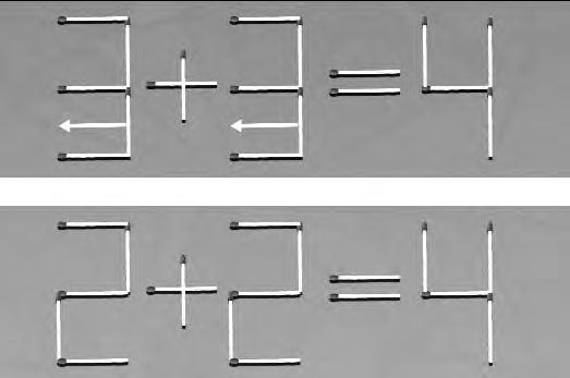 Ëîãè÷åñêèå çàäà÷êè ïîëüçóþòñÿ îãðîìíîé ïîïóëÿðíîñòüþ. Ïîëüçîâàòåëè ïîñòîÿííî ðåøàþò ðàçëè÷íûå ãîëîâîëîìêè èëè îïòè÷åñêèå èëëþçèè. Îäíèìè èç òàêèõ çàäà÷åê ÿâëÿþòñÿ ãîëîâîëîìêè ñî ñïè÷êàìè. Ðåøàòü èõ íåïðîñòî, âåäü ýòè âûçîâû òðåáóþò óìåíèÿ ìûñëèòü íåñòàíäàðòíî. Èòàê, ìû èìååì ðàâåíñòâî 3+3=4. Ñ ìàòåìàòè÷åñêîé òî÷êè çðåíèÿ îíî íåâåðíî, ïîñêîëüêó òâåò äîëæåí ðàâíÿòüñÿ øåñòè. Âàì íóæíî èñïðàâèòü ýòó îøèáêó, ïåðåñòàâèâ âñåãî äâå ñïè÷êè . Ìåíÿòü ìîæíî êàê öèôðû, òàê è àðèôìåòè÷åñêèå çíàêè.