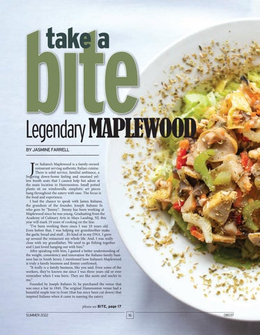 Jimmy Jr was light-hearted and passionate when discussing the origin story of Joseph Italiano Sr. taurant it is today. Nonetheless, the success of Maplewood goes beyond lighthearted lines of origin and food. It’s the name: Italiano. A family name that speaks of wonderful food, tight bonds and courage to expand for the better. With various locations and family rooted in every establishment, Maplewood is a warm, delicious and welcomingAlthoughexperience.Joseph Italiano Sr planted the seed and nurtured the initial growth of Maplewood, it was his son who brought the authentic Italian home cooking to the restaurant that gave it a luminous spotlight. His son, Joseph Italiano Jr, created and incorporated the well-known white seafood sauce. The white seafood sauce can be enjoyed from their signature please see BITE, page 18 PHOTOS BY JAMIE GIAMBRONE