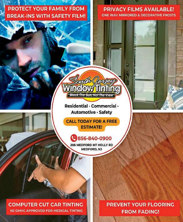 For more information, call toll free 1-800-985-8468 or email southjerseywindowtinting@ gmail.com or visit our website at southjerseywindowtinting.com. South Jersey Window Tinting is located at 206 Medford-Mt. Holly Rd., Medford NJ 08055.
