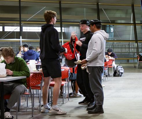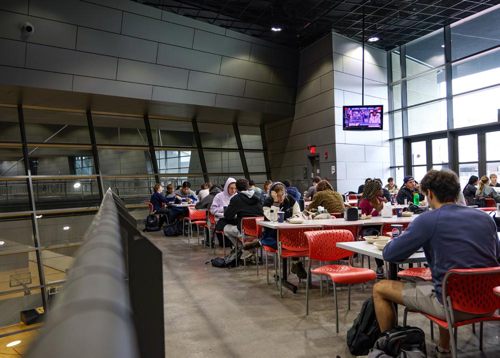 of campus. Close enough that during the football season the café is open with a special menu for game days. Inside, students are also located directly on top of Center Court, with a ledge overlooking the dining hall below.