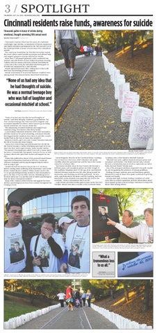 “None of us had any idea that he had thoughts of suicide,” said Vicki Murphy, Gambrel’s grandmother. “He was a normal teenage boy who was full of laughter and occasional mischief at school. I don’t want to go on living myself sometimes. He was my whole life.” The outpouring of mixed emotions and support was common along Cincinnati’s Ohio River banks. Local trained volunteers from the AFSP were on hand to provide resources for grief counseling, and many friendly four-legged family members were there to provide a muchneeded lick on the face to those who needed it. Banners, T-shirts and “Love Life 4 Jason” bracelets honored the life of 23-year-old Jason Dennis. “Jason was a fun-loving and affectionate boy all [of] his life, but he became a victim of bullying and it got to be too much for him,” said Angie Dennis, Jason Dennis’ mother. “We started a Facebook site called ‘Love Life 4 Jason’ and it has been a wonderfully therapeutic resource for us, as well as many others who post their stories and support on our site.” Those who gathered in honor of 28-year-old Daniel Braun expressed tremendous frustration with the Cincinnati Veteran’s Hospital and the psychological help he had to wait so long to get. “Daniel served two tours in Iraq in the U.S. Air Force before coming home suffering from depression,” said Linda Braun, Daniel Braun’s mother. “When Daniel went to the VA to get psychological help, he had to wait six months to get in. By then it was too little, too late. Something has to be done about our VAs and the lack of timely psychological help for these traumatized soldiers.” Many other combat-related stories and appeals for more military psychological services were echoed throughout the evening’s event.