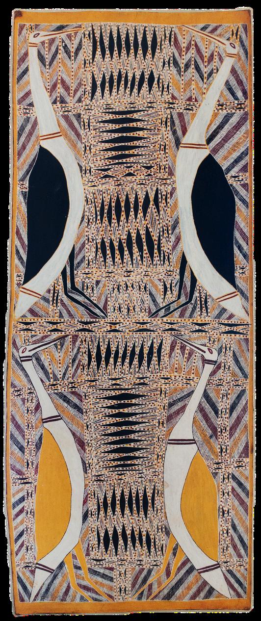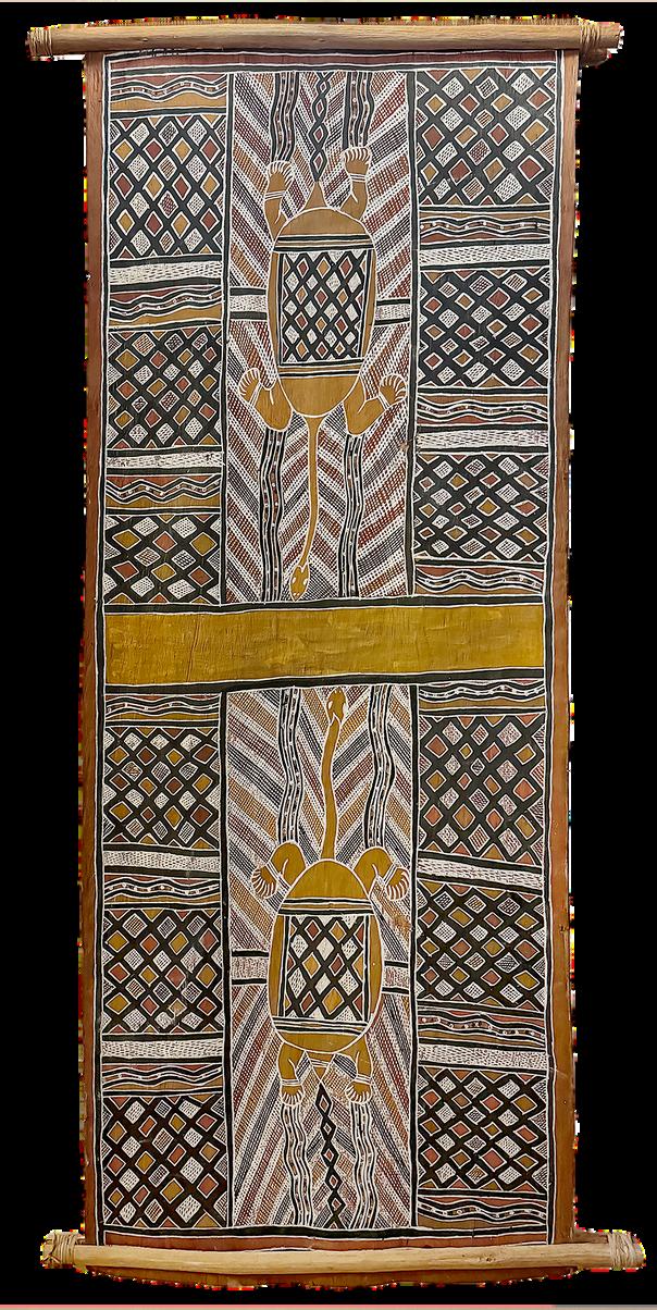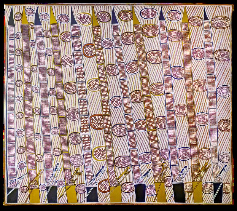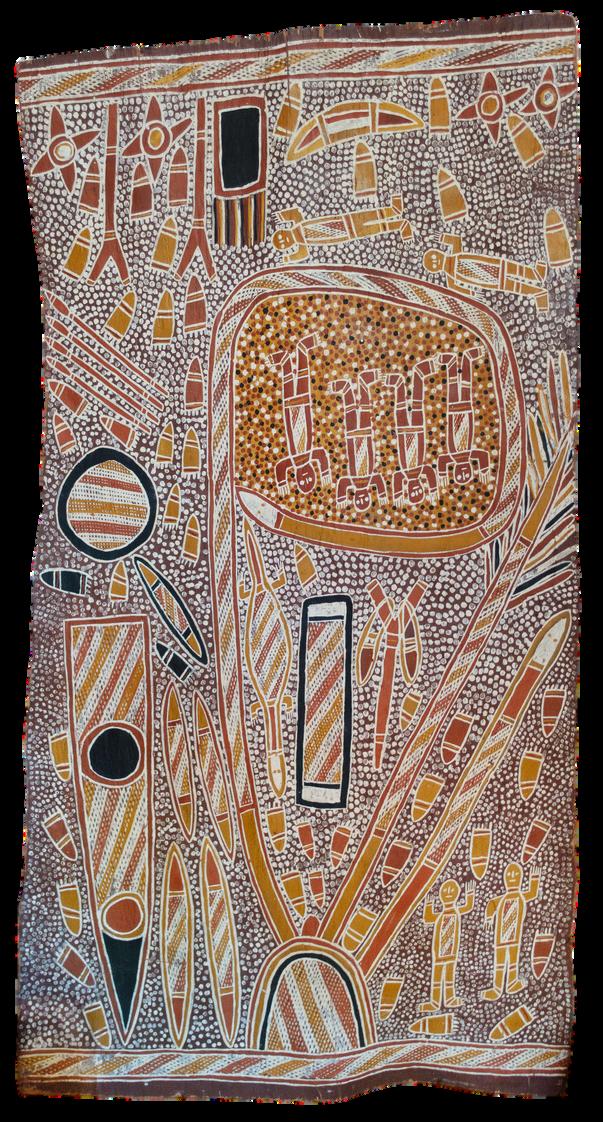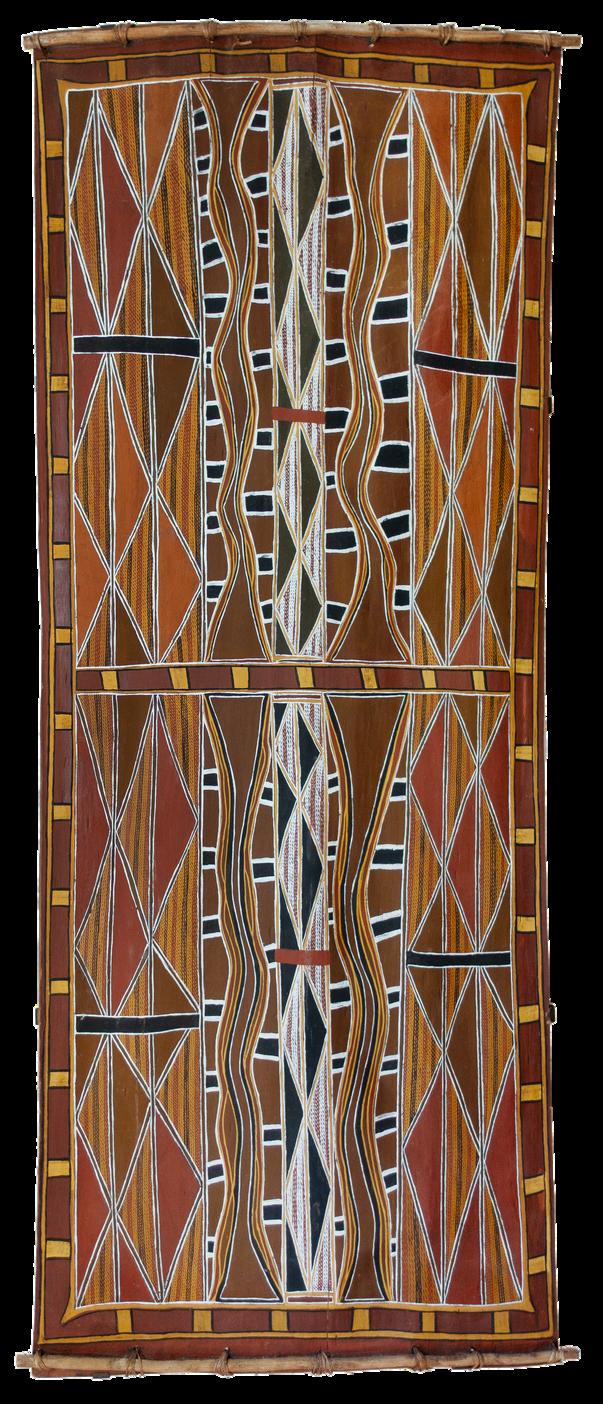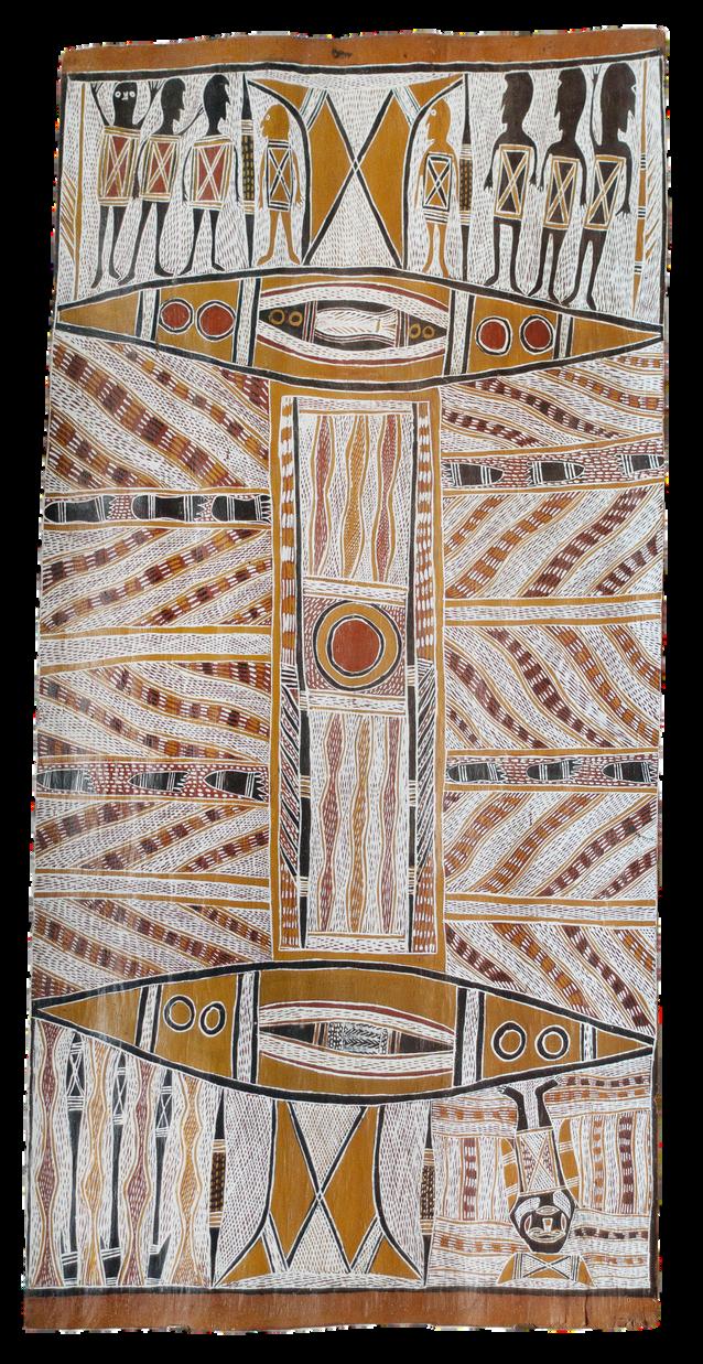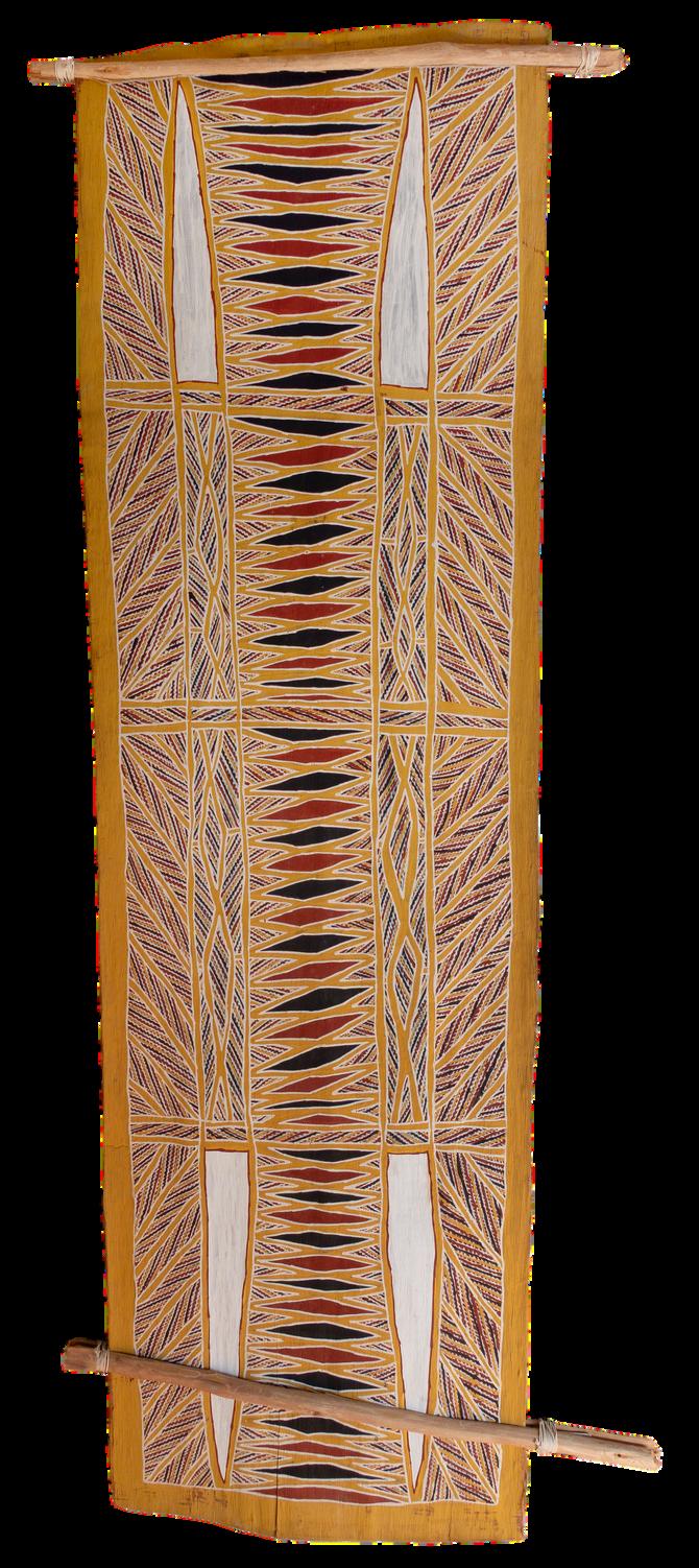 Alongside Warangkula’s masterpiece, Dr. Gilbert assembled a distinguished group of early Papunya boards and Eastern Desert canvases, as well as a suite of monumental 1990s barks. Some works he shared more widely, through select donations and loans, extending their reach beyond his home and into the public sphere.