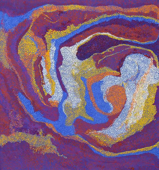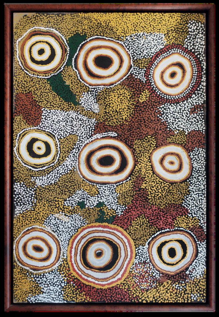 Compositionally, the work fuses the energy of Warangkula’s early 1970s boards with the speckled, overlapping dot technique of his later canvases Concentric roundels mark waterholes and ceremonial sites; ancestral tracks weave across the surface; fields of luminous dots evoke desert light after rain At this scale, the composition channels the elemental drama of storm and water – motifs that defined Warangkula’s identity as both ceremonial rainmaker and artistic innovator As Vivien Johnson has written, “Family is artistic destiny in the Western Desert” – a truth borne out in this collaboration between Johnny, Gladys, and possibly other family members