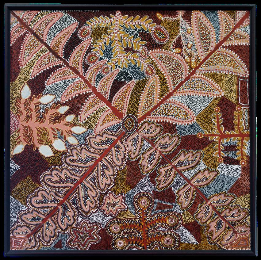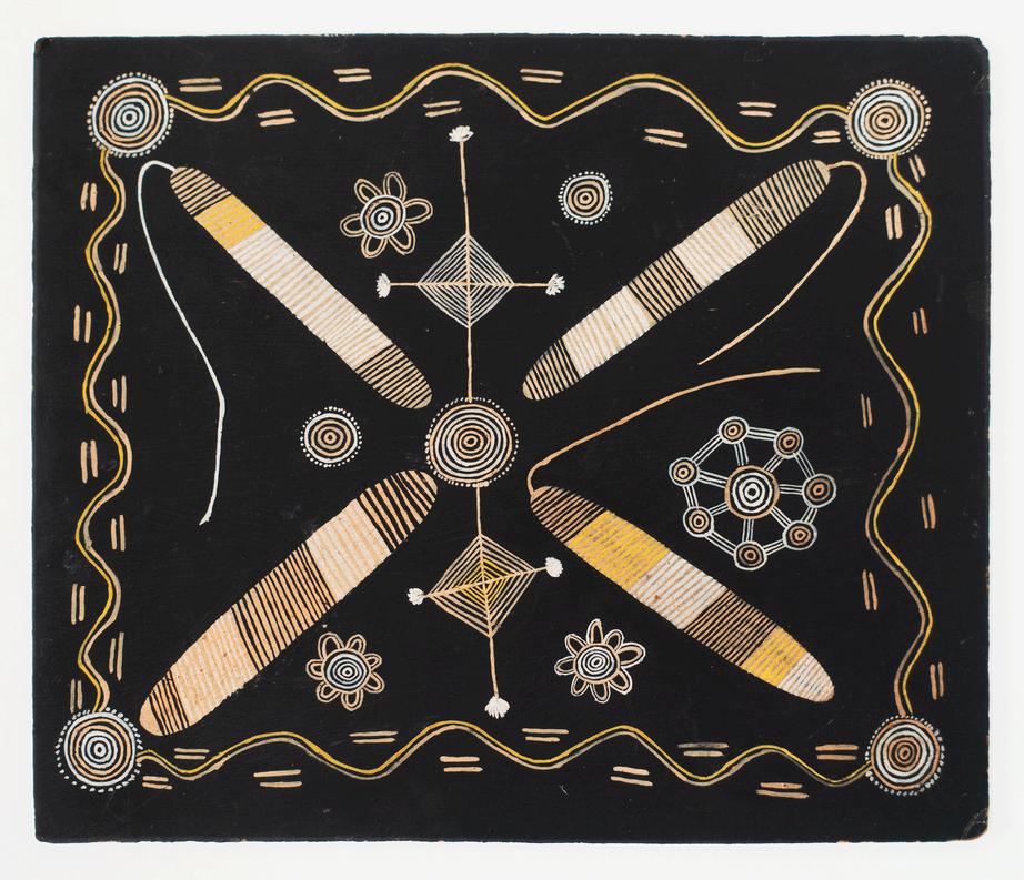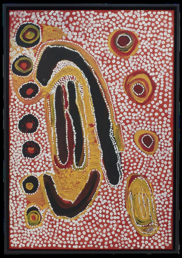 The background recalls some of Warangkula’s finest early- and mid-1970s boards – an effect that might initially seem almost too good to be true. Yet the hallmarks of his hand are undeniable: the loose, assured brushwork; the seemingly casual but deeply controlled composition; the dense rhythm of dotting. The refined passages of dotwork suggest the involvement of his wife, Gladys Yawintji Napanangka, herself a Papunya Tula painter whose large-scale canvases featured at World Expo ’88 in Brisbane. Far from complicating authorship, such collaboration reflects the kinship model central to Papunya Tula, sustaining the production of major canvases through the late 1980s. Gladys’ hand enriches the surface, amplifying its shimmering vitality.