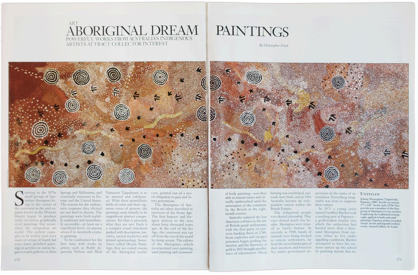 Its international profile was confirmed in May 1998, when Architectural Digest (Vol. 55, No. 5) devoted its Arts section to “Aboriginal Dream Paintings.” Several galleries worldwide were invited to submit what they considered their strongest examples of Aboriginal art. The editors selected this work as the lead painting, reproducing it across a two-page spread. Its secure provenance, long-term ownership, and prominent exposure in one of the world’s most prestigious design publications enhance both its rarity and appeal