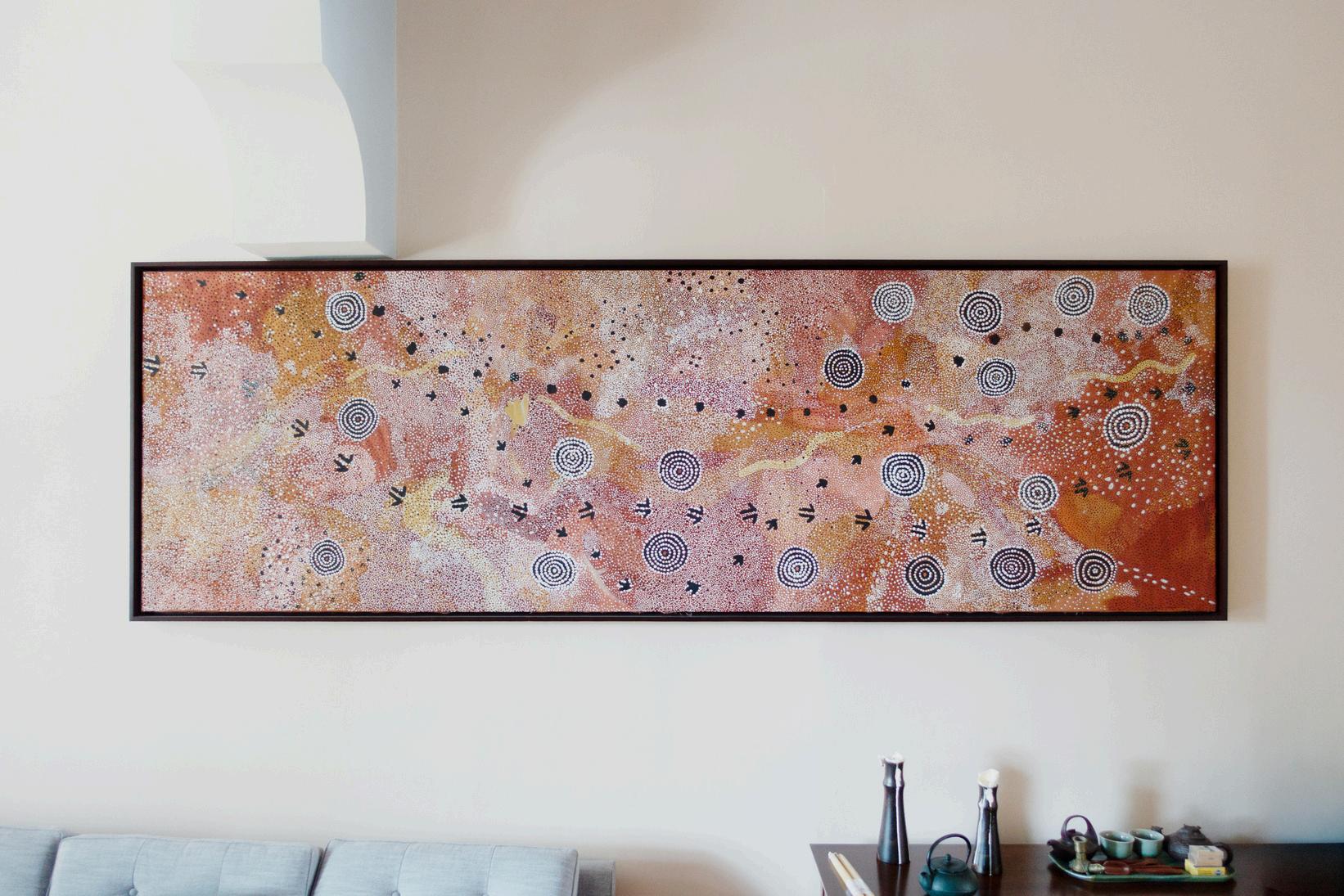 At the heart of the collection stands the work attributed to Johnny Warangkula Tjupurrula, Water Dreaming, 1989 – a monumental three-metre canvas later described as “ one of the crown jewels of the entire Australian Aboriginal art movement ” Shipped by Rodney Gooch to Mary Reid Brunstrom’s Austral Gallery in St Louis in 1993, and acquired soon thereafter by Dr. Gilbert, the painting went on to achieve international recognition when it was chosen for the centre spread of Architectural Digest’s 1998 feature on Aboriginal art. For Dr. Gilbert, it was simply: