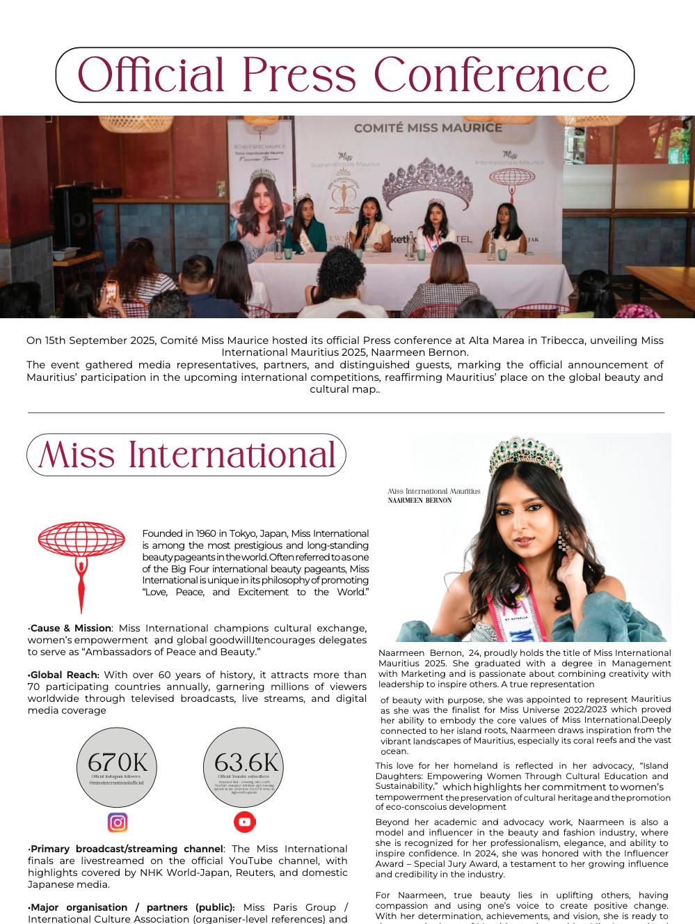 •International Visibility – Exposure to millions worldwide through media coverage, live broadcasts, and social media campaigns linked to Miss International & Miss Supranational.