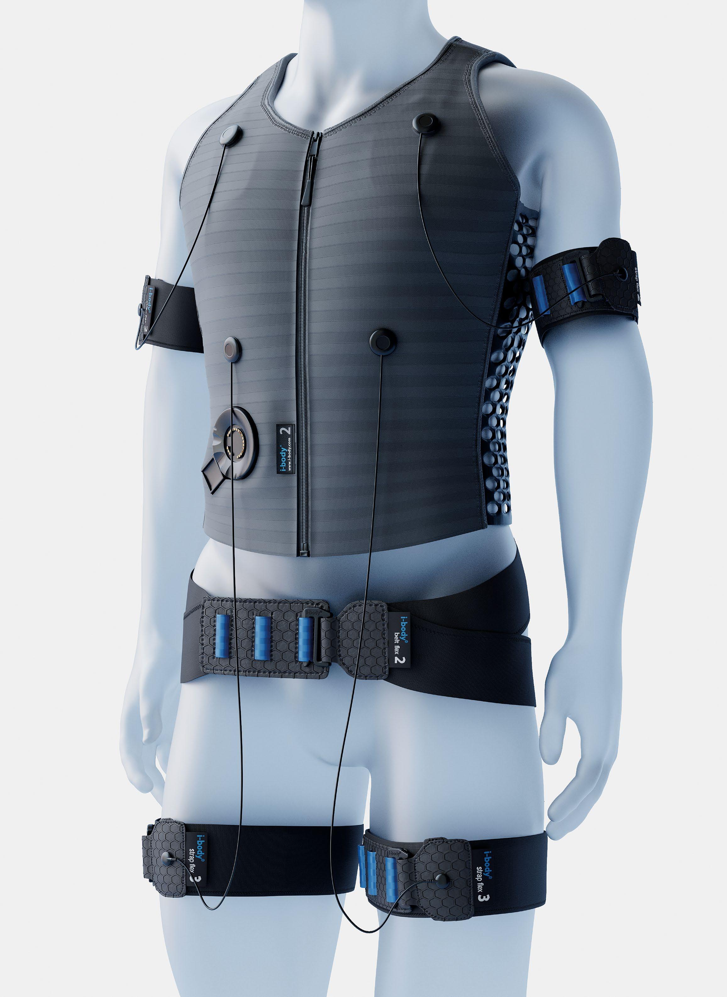 The i-body belt consists of an elastic waist belt with a pair of electrodes to stimulate the gluteal muscles. The belt is connected to magnetic contacts on the back of the i-body vest.