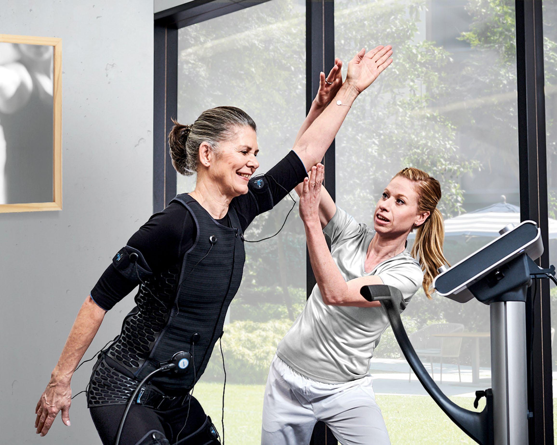 an innovative concept which we have pioneeredWhole-Body EMS. It seamlessly integrates the established passive component of electrotherapy with an active exercise approach with personal care.