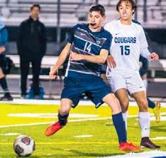 Wharton senior Justin Scott celebrated Senior Night (top right) by being announced as a starter for the school’s soccer team, to the delight of his teammates (bottom right) and then diving right into the action and mixing it up with the Durant Cougars. (Photos: