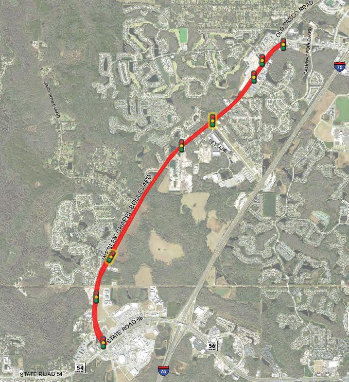 The map (right) shows the full length of the $69.4-million contract to widen Wesley Chapel Blvd. from (mostly) two to six lanes between Old Pasco Rd. & where S.R. 54 & S.R. 56 meet. All of the existing and planned traffic signals are shown, with the planned “additional” signals outlined in yellow. Please note that the signal that is “planned” at the intersection of Stagecoach Village Dr. and WC Blvd. is already there, but that is considered to be a “temporary” signal that will be replaced. (Map: Provided by Pasco County, modified by Charmaine George & GN)