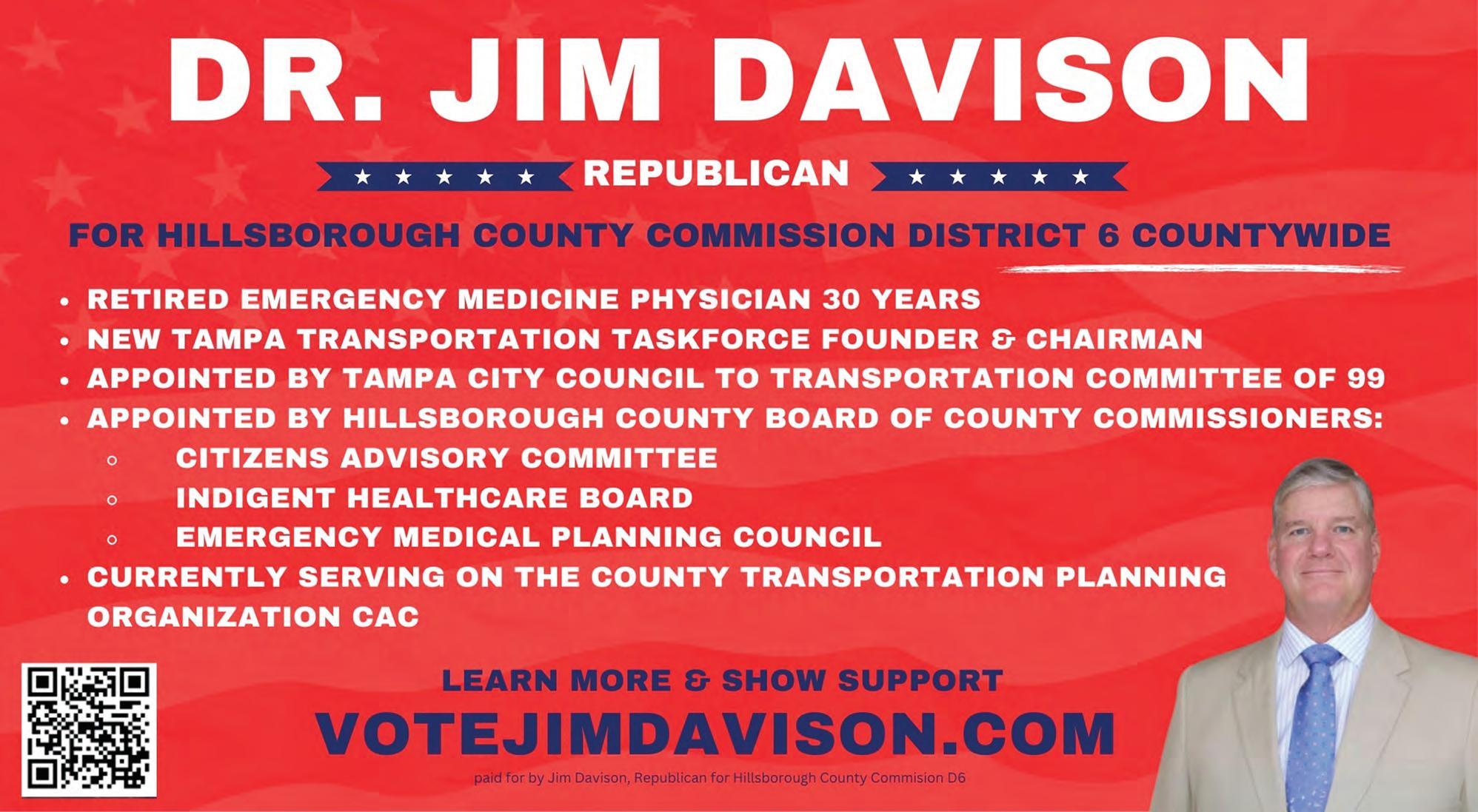 County Commissioner, District 6 — Longtime New Tampa resident and activist Dr. Jim Davison faces long-time Hillsborough firefighter Chris Boles in the Republican primary for this countywide seat. In November, the winner will face the winner of Sean Shaw vs. Joseph Ryan Taylor in the Democratic primary.