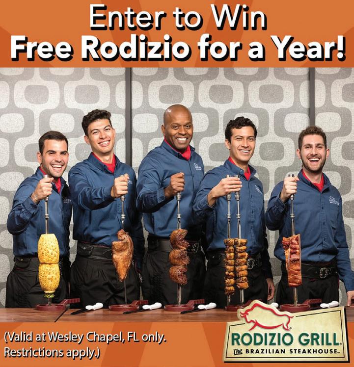 Just around the interior road from the former MOD Pizza location is the long-awaited firstever Brazilian steakhouse in our area — Rodizio Grill, which franchise owner Charlie Haney has announced is expected to open on Wednesday, May 28. Until then, visit Rodizio Grill-Wesley Chapel on Facebook by May 20 to win free Rodizio for you and a guest once a month for a year (photo).