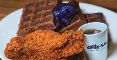 a combination of three thick slabs of the crispi est (and yet, still juicy) panko-fried chicken served with three of the only waffles I’ve ever had made from ube — also known as the vibrant purple yam (sweet potato) originally used primarily in The Philip pines. The waffles also are topped with a generous dollop of creamy ube butter and served with a sake cup of ginger maple syrup. If you’re the kind of person who tries the fried-chicken-&-waffles at every place that serves them and don’t think this is among the best you’ve ever had, feel free to let me know what you didn’t love about it.