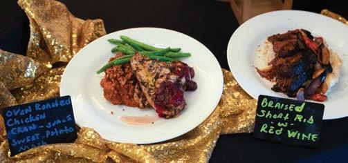 Among the tasty treats served at the Jingle Mingle were small, plated samples of holidayinspired dishes — like grilled orange salmon on a bed of tasty rice with fresh asparagus (top), ovenroasted chicken with house-made cranberry sauce and an addictive sweet potato mash and braised short ribs with red wine sauce, accompanied by a baby carrot medley and mashed potatoes. And, all of them were actually as appealing to the palette as they were to the eyes.