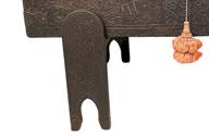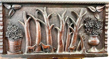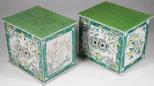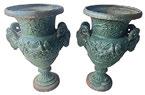 “Practice Mats” painting and fabric by Ali 18thC inlaid octagonal wine cellarette Pair 27” cast iron urns with ram’s heads