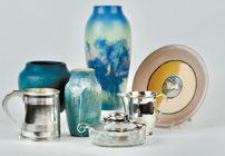 chest, antique QA mahog side chair, red 6 board blanket chest, 18th C mahog games table w/b&cl feet, lg Burlwood English server, fine custom 20th C inlaid tambor desk made for the Chafee RI family, fine heavy lg leather ottoman by Powell & Bonnet with chrome, unusual oak and bamboo bookshelf, nice pr decorative signed Henredon “Acquisitions” bowfront servers, mah HL Holland design server, 2 part inlaid dining table (William Tilman) w/leaf, nice quality leather “Knoll” style desk chair, 2 section leaded barrister bookcase, demilune English table, In the style of Weiner Werkstadde deco wardrobe “Judendstil”, Beidermeier style deco burled wardrobe, pr antique baroque open armchairs, mah Pr. signed Council Craftsman Pembroke tables, Renaissance style fruitwood “monks” table, and more. ITEMS OF SPECIAL INTEREST: Unusual art deco Rattan “Paul Frankl” designed 5 pc garden set (sofa, 2 arm chairs, table and floor lamp), fine signed D.R. Dymes bold tiger maple Queen Anne dining tale with 2 leaves, nice signed D.R. Dymes tiger maple sideboard, pr 27” cast iron urns with ram’s heads, and more. ACCESSORIES: 15” Charder LeVerre Francais “Digitalis” vase, Japanese metal shield c 1800, Chelsea Asian desk clock, 18thC Terracotta duck in form of tea pot, Louis Vuitton suitcase, Pair of Asian porcelain vases with roosters, Delft apothecary jar (conv to lamp), pr 21” Chinese cloisonne vases, tall oxblood lamp with shade, Herend porcelain, Asian enameled bowl, Signed Vaughn decorative Asian floor lamp, Ochre & brown glazed planter Chia Tao Kuang period, Manuscript album paintings on skeletonized Bo Tree leaves in wooden covers, Decorative faux book/decanter set, Treasure Island banjo clock, brass lamps with tole shades, LeVerre nice decorative lamps, antique floral pattern table lamp, oriental lacquered lunch pail, Bronze vase with monkey, Asian porcelain, Rosenthal portrait, Catalan redware bowls Trouvailles, lg lot majolica, Limoges punch