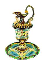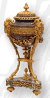 The late Nineteenth Century japonese gilt bronze, champleve and onyx centerpiece was created in the manner of the French metalworker and manufacturer Ferdinand Barbedienne (1810-1892). The apparently unmarked centerpiece, 16¾ inches tall, boasts naturalistic branch-form handles, enamel flower heads and crane plaques, and an oval body, rising on scrolled feet with grotesque masks ($4/6,000).