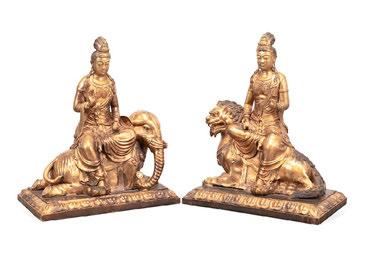 Large pair of Chinese gilt bronze Guanyin figures seated on a recumbent elephant and guardian lion, raised up on a rectangular plinth with a border of lotus petals ($5/7,000).