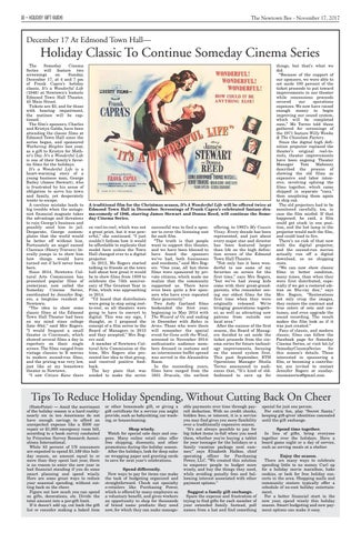 A traditional film for the Christmas season, It’s A Wonderful Life will be offered twice at Edmond Town Hall in December. Screenings of Frank Capra’s celebrated fantasy-drama-comedy of 1946, starring James Stewart and Donna Reed, will continue the Someday Cinema Series. on reel-to-reel, which was not a great print, but it was powerful,” she continued. “I just couldn’t fathom how it would be affordable to replicate that model here unless the Town Hall changed over to a digital projector. In 2012, Ms Rogers started talking to friends at the town hall about how great it would be to show films from 1939 to celebrate the 75th anniversary of The Greatest Year in Film, which was approaching in 2014. “I’d heard that distributors were going to stop using reelto-reel, so all theaters were going to have to convert to digital. This was my sign, I thought, so I proposed the concept of a film series to the Board of Managers in 2013 and they accepted,” Mrs Rogers said. A member of Newtown Cultural Arts Commission at the time, Mrs Rogers also presented her idea to that group, and received positive feedback. The key piece that was needed to make the series