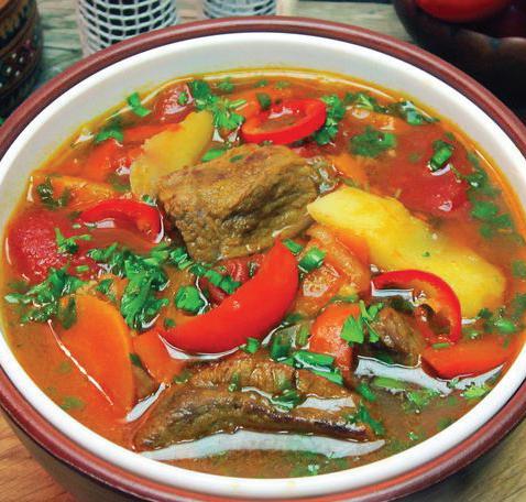 казан (если нет казана, можно приготовить в мультиварке или отдельно пожарить на сковороде). Обжарить с двух сторон на сильном огне, добавить морковь, нарезанную кружками, и лук полукольцами; всё вместе протомить, довести овощи до мягкости. Добавить воду и томить около 1 часа (не забывая снимать пену). Тем временем, начистить картофель и перец сладкий (острый пока трогать не надо). Время подошло, надо закладывать и остальные