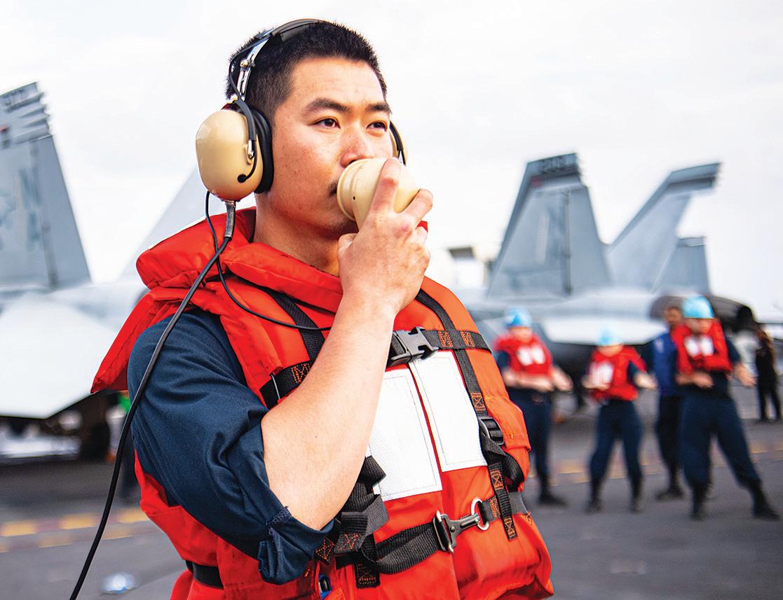 U.S. Navy Seaman Jeffruy Chen, from Washington, N.J., stands the phone talker watch on the flight deck of the aircraft carrier USS Nimitz (CVN 68) during a replenishment-at-sea. Nimitz is in U.S. 7th Fleet conducting routine operations. 7th Fleet is the U.S. Navy’s largest forward-
