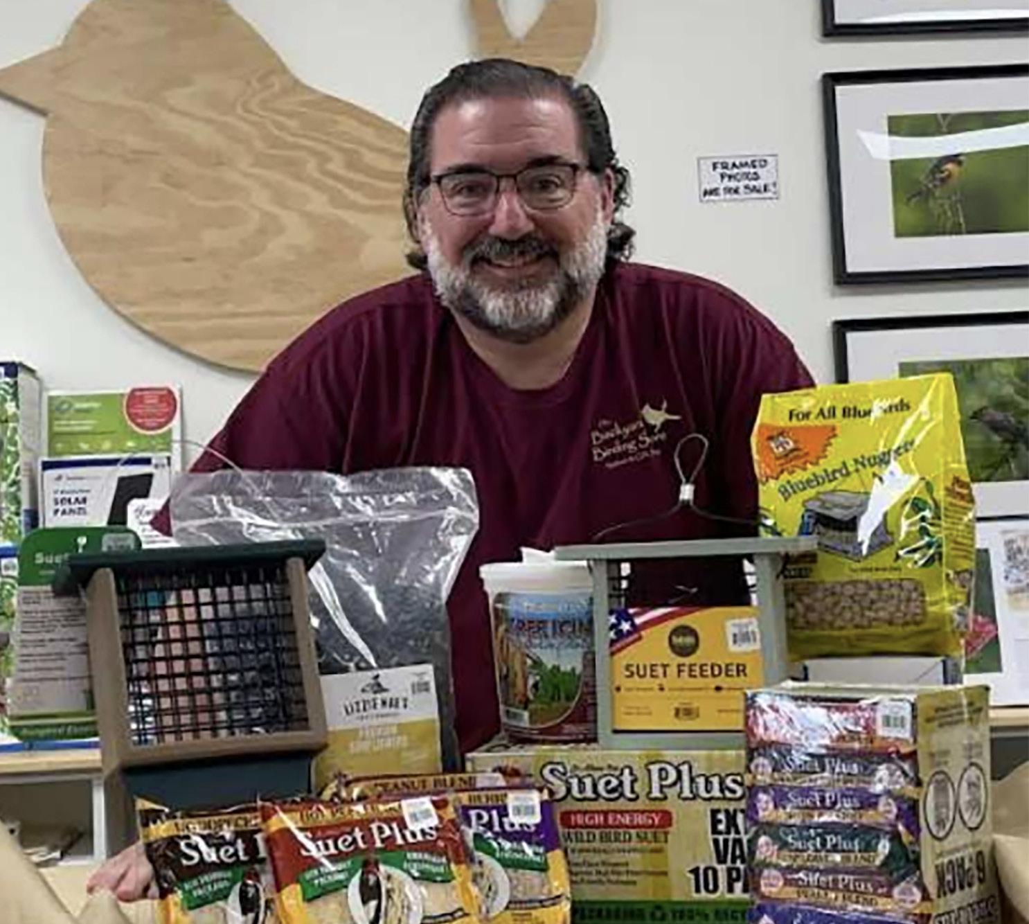Winter birding products in ample supply. Andrew Marino, Owner of The Backyard Birding Store.