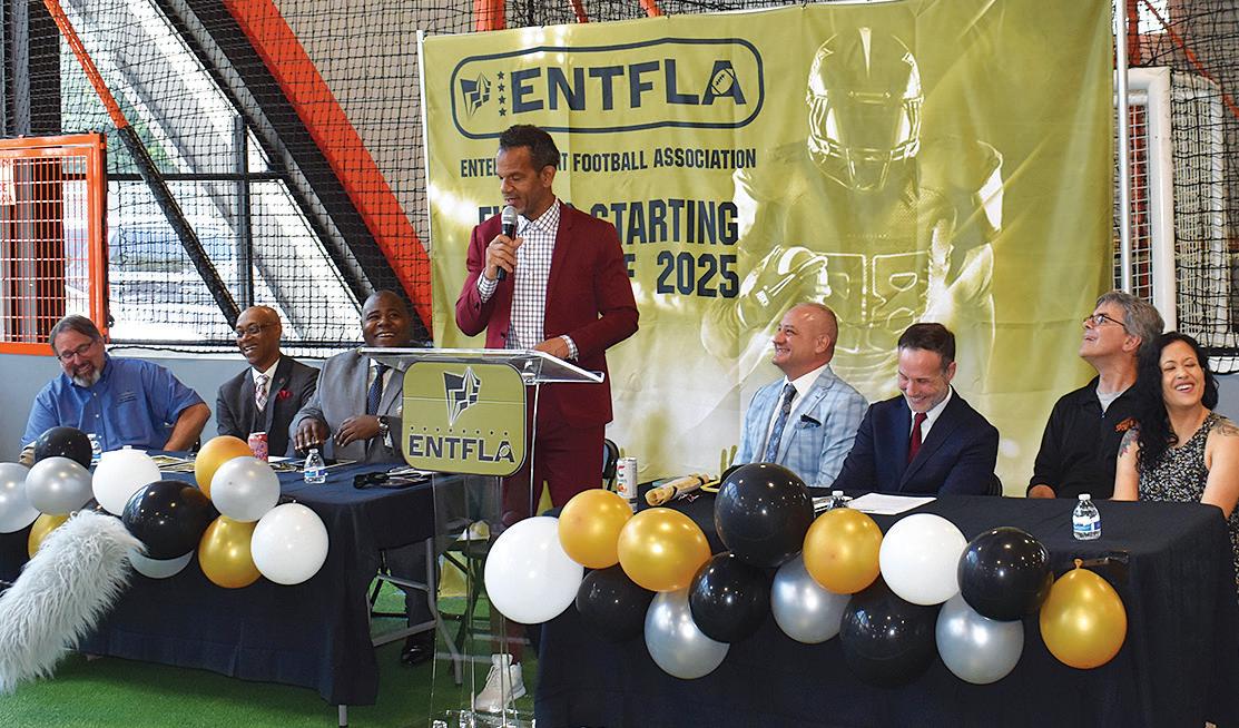 AREA - On June 13 at the Dover Sportsplex in Dover, New Jersey, representatives of the new Entertainment Football Association (ENTFLA), announced at their introductory press conference that Morristown had been awarded a three of four available franchises for the inaugural 2025 summer season. The 2,500 seat William G. Mennen Sports Arena will be the Morristown team’s home arena. A coach for the Morristown team has not yet been hired, and the team’s name is up to the fans, who can visit he league website at https:// www.goentfla.com/morris-county/ and make suggestions. In September, the franchise will also host an inschool coloring contest for students to design the Morristown uniforms. National Football League Hall of Famer, Andre Reed, Commissioner of the new Entertainment Football League (ENTFLA), a brand of the Entertainment Football Association, said, “There’s nothing better than to see a community come together through sports. Especially in small towns like Morristown, communities feel a sense of pride when there is a strong purpose to uplift all those involved there. Businesses begin to flourish more when everybody is involved. Our communities are an important part to cities being uplifted by the people who live and prosper.”