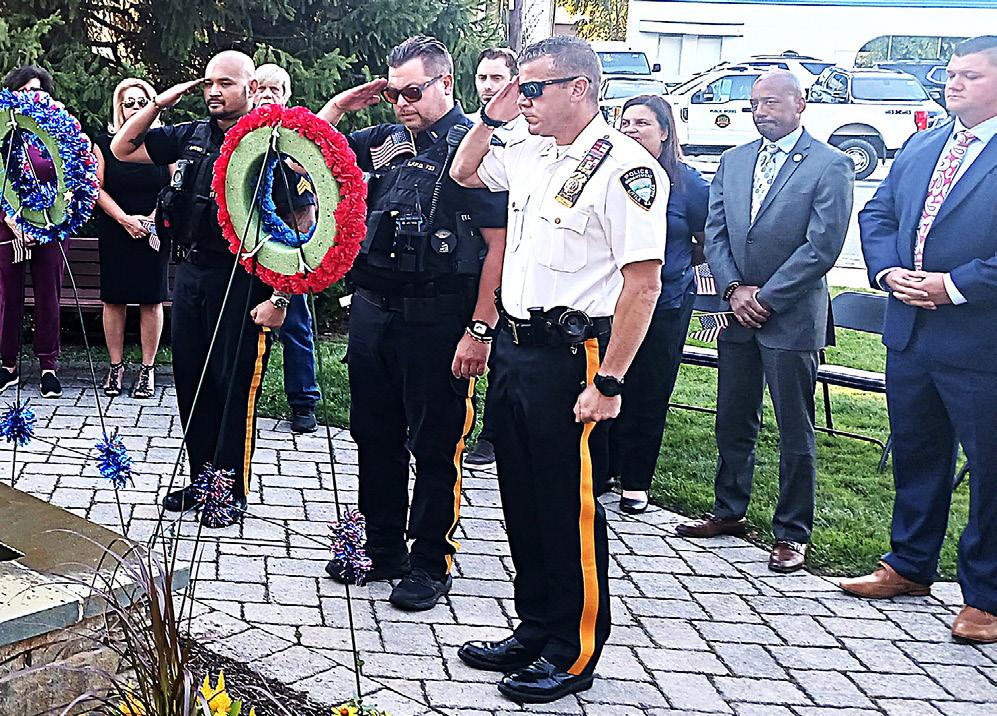 the 9/11 Memorial. The second wreath was then placed by Police Chief Bryan Prall and officers of the LFPD. LFFD Chief Ken Cichy placed a third wreath, along with the Cordice family.