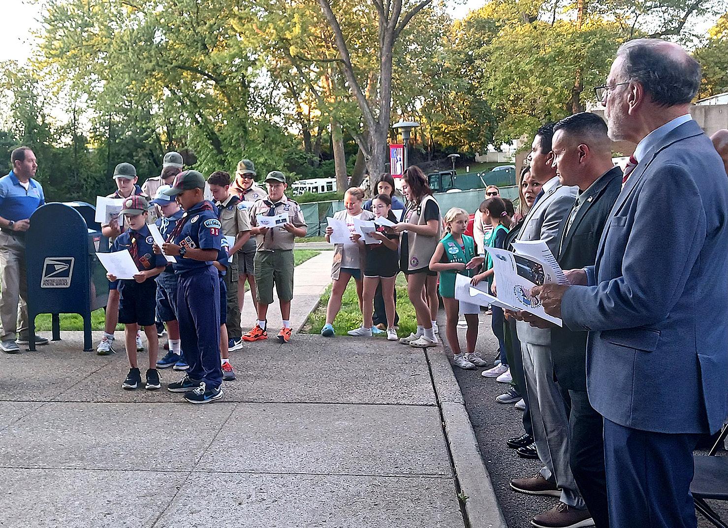 Council President Anthony Sgobba welcomes attendees flanked by Boy Scout Troop 14 during the Little Falls 9/11 ceremony marking the 24th anniversary of the terrorist attacks.