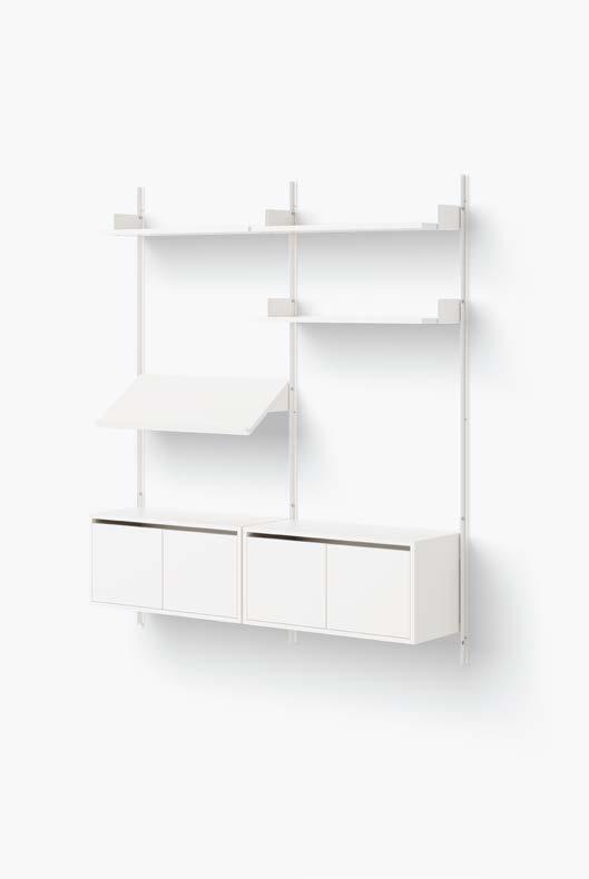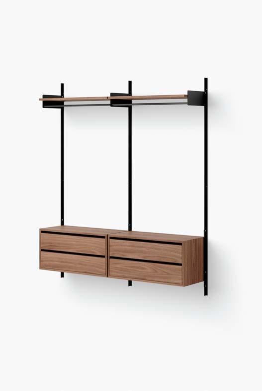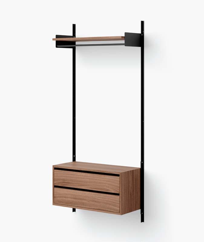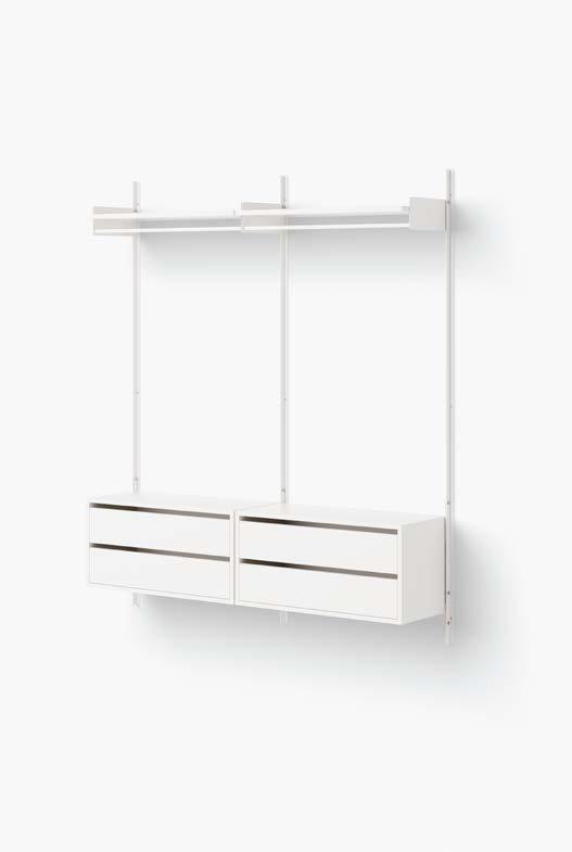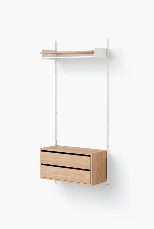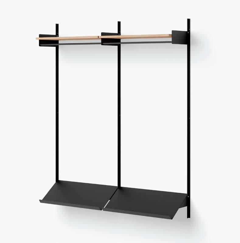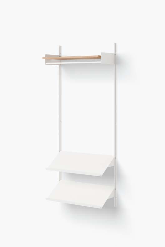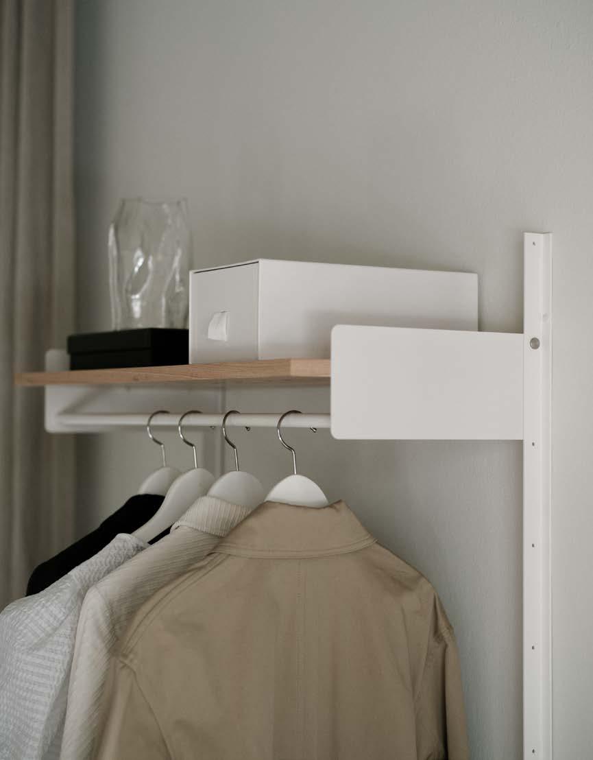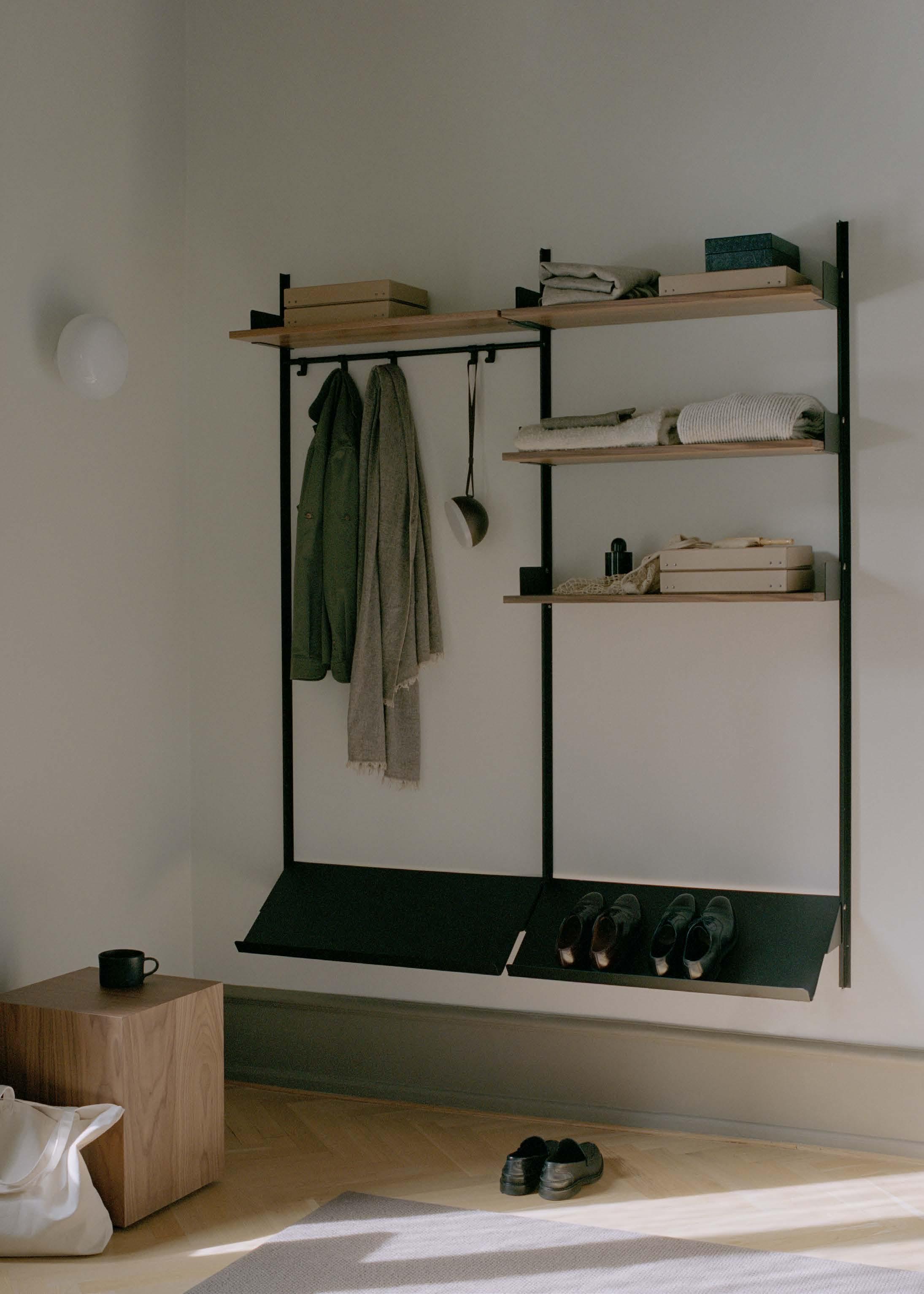A combined hat shelf and hanger, a shoe shelf, and a coat rack can be combined with the system’s wall bars and shelves to create organised and attractive open storage solutions. With the same elevated simplicity in the details, which characterises the shelving system, your wardrobe wall shelf will appear as a beautiful whole.