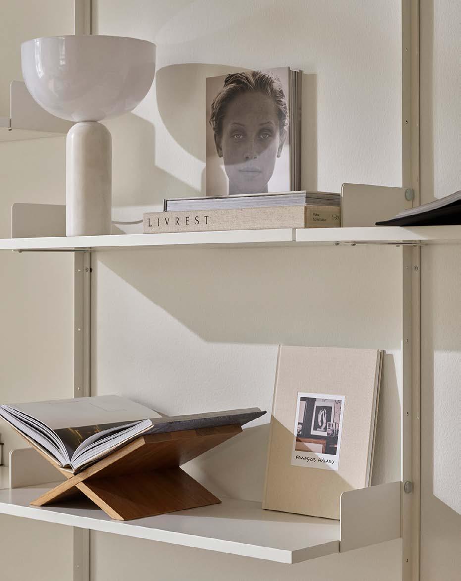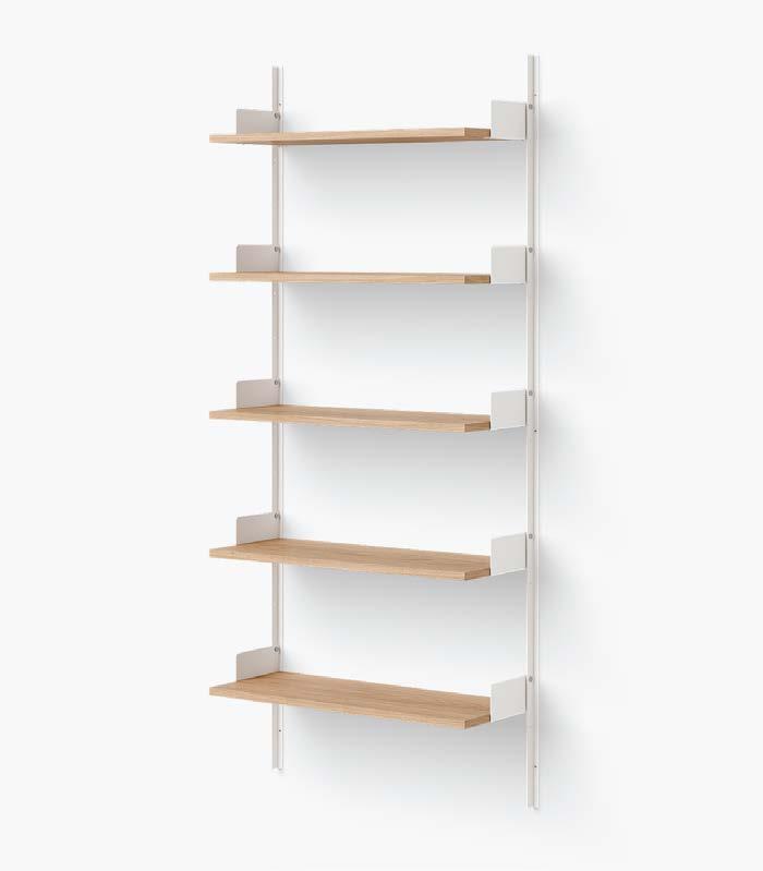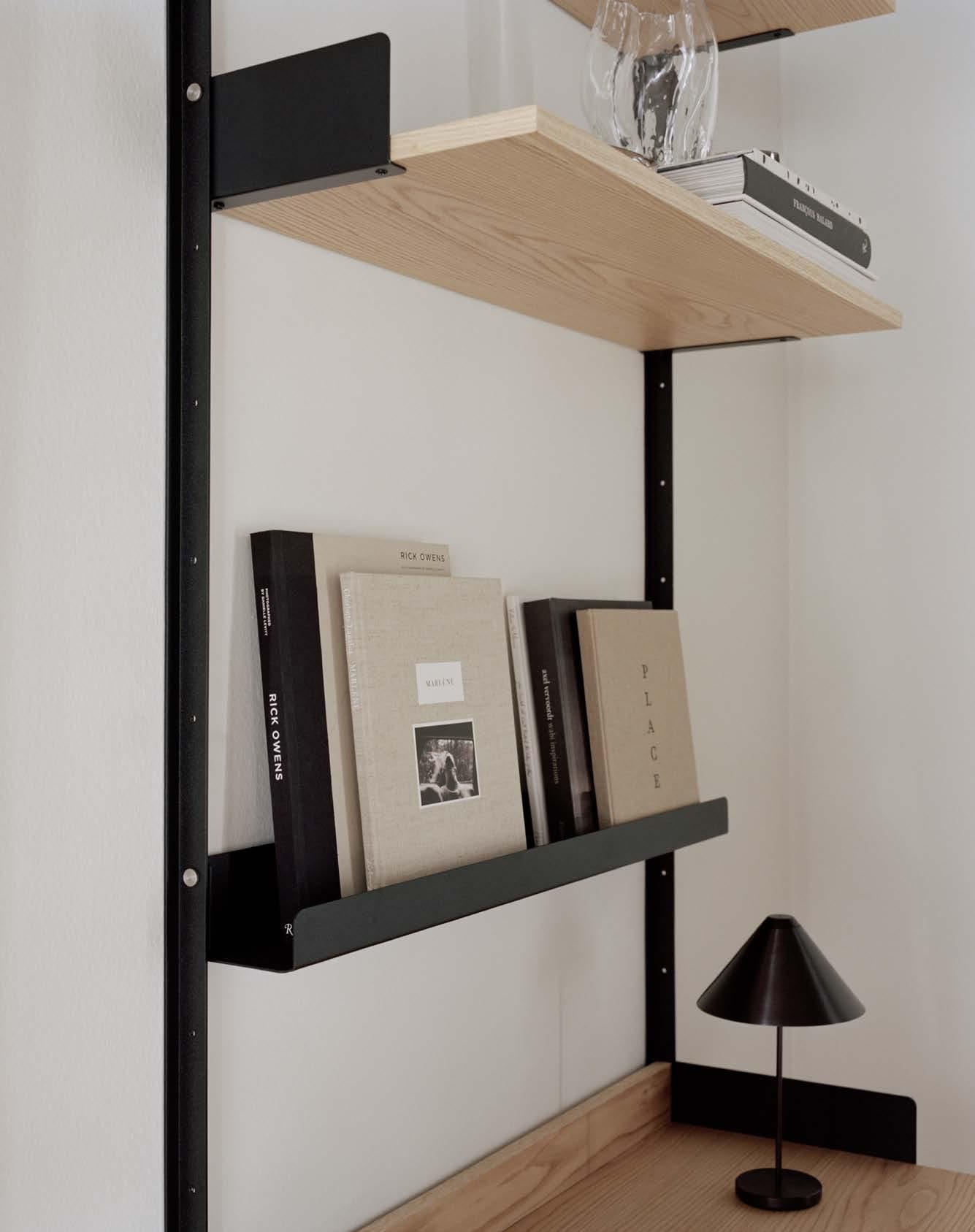 Nothing is surplus and everything has been carefully attended to, like the angular profiles of the wall bars and the integrated bookends that keep your belongings in place. The shelves are neatly assembled with flat knurled screws in stainless steel, adding an honest yet refined detail to the design. A system that is meant to grow - in your home and in range – to accommodate various storage needs.