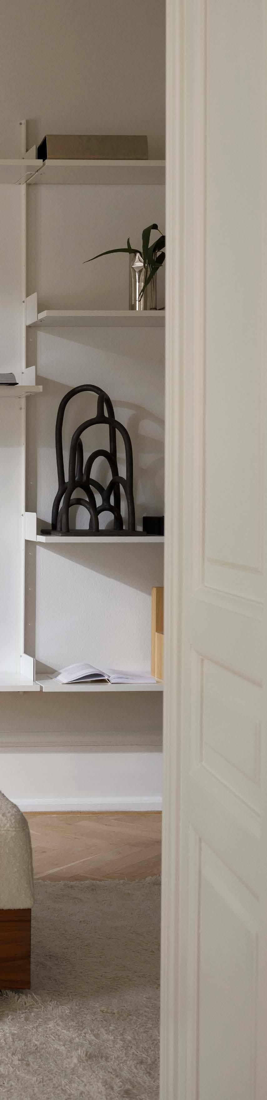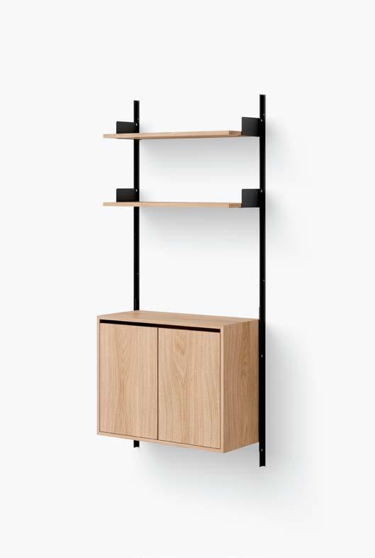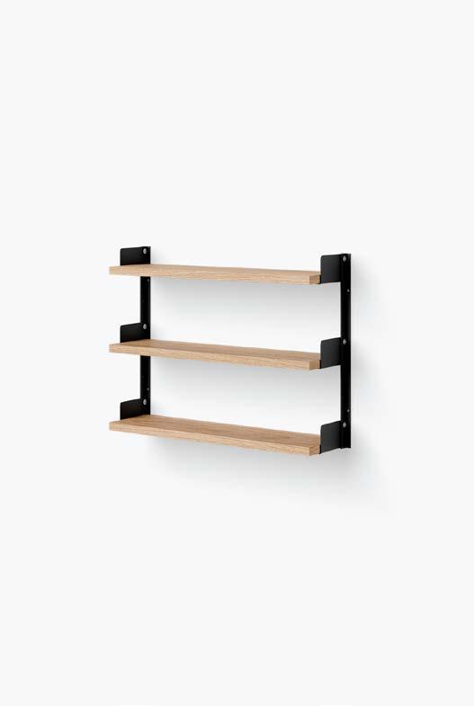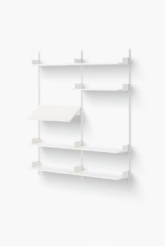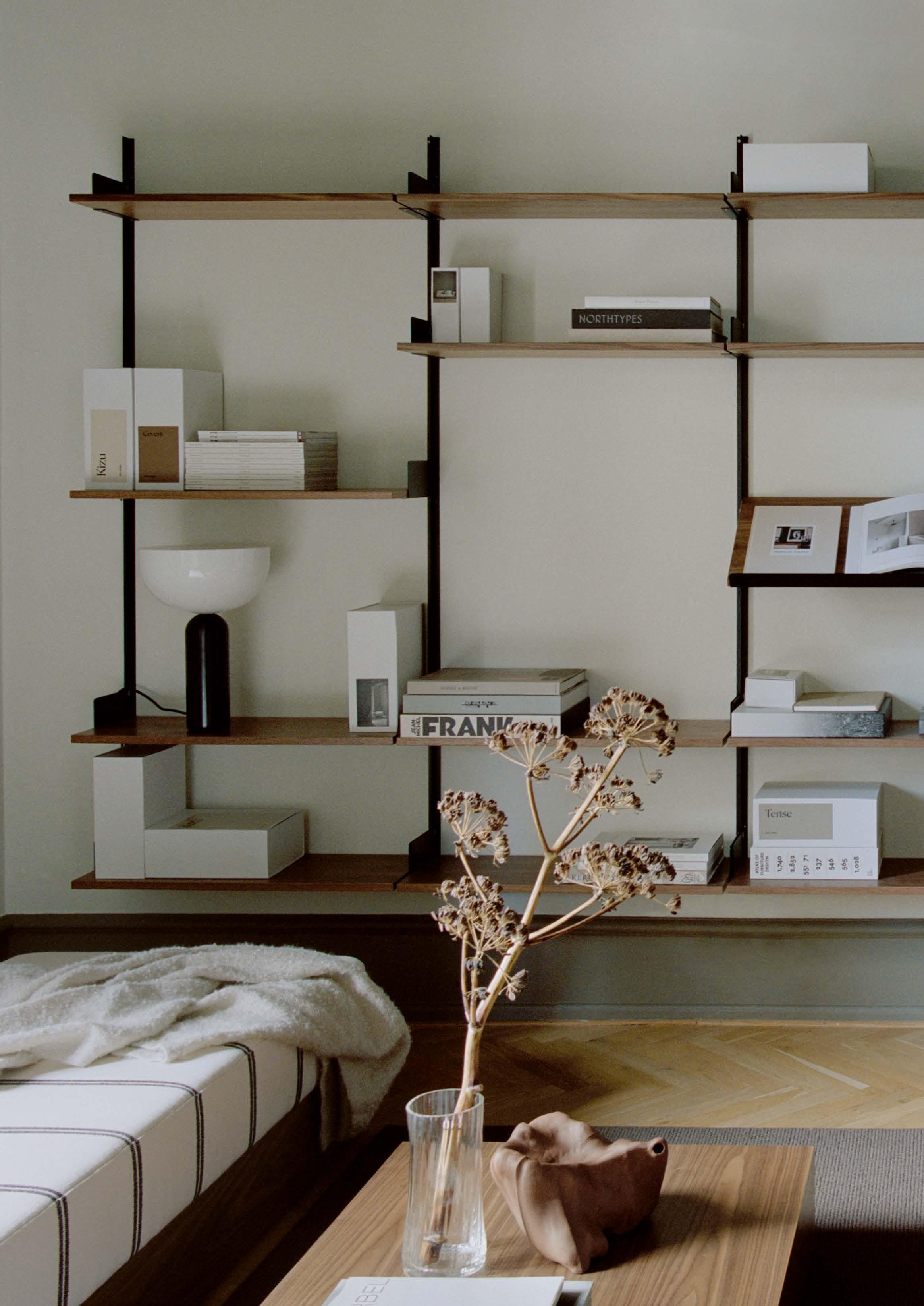 Nothing is surplus and everything has been carefully attended to, like the angular profiles of the wall bars and the integrated bookends that keep your belongings in place. The shelves are neatly assembled with flat knurled screws in stainless steel, adding an honest yet refined detail to the design. A system that is meant to grow - in your home and in range – to accommodate various storage needs.
