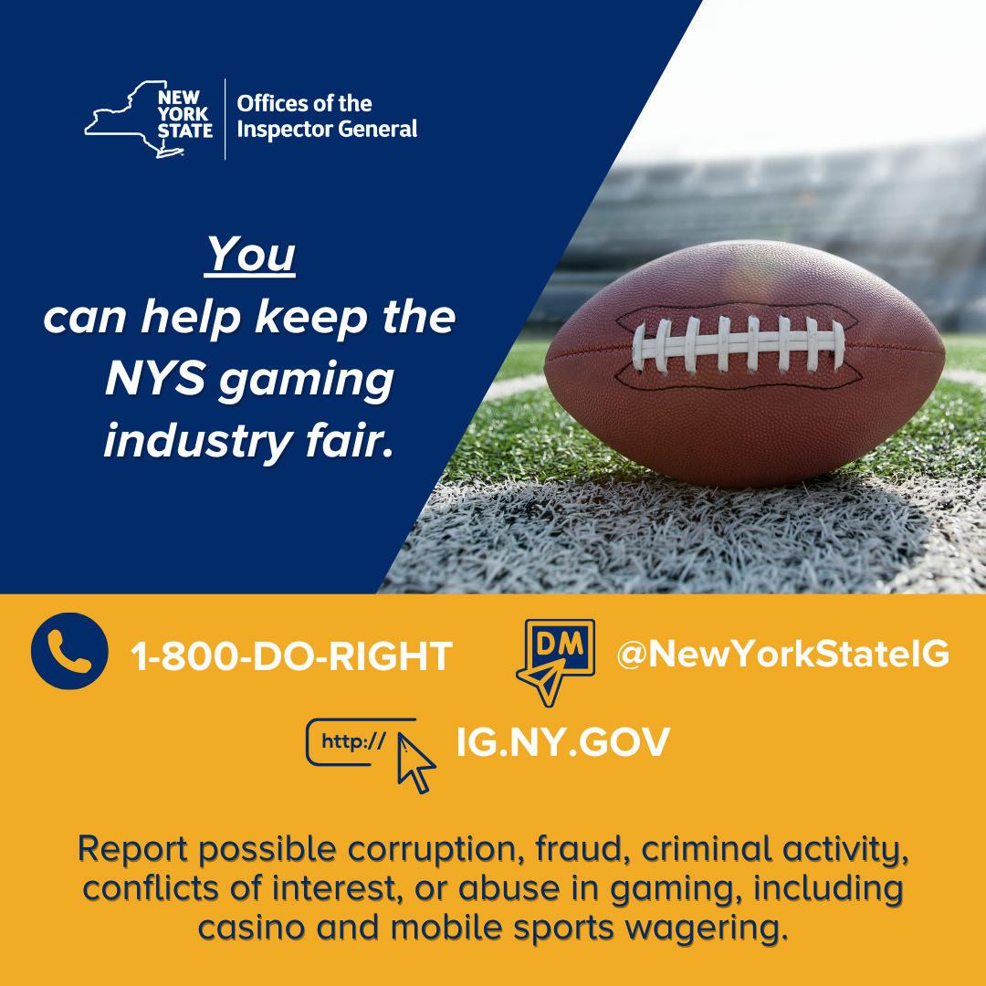 The New York State Gaming Commission (Commission) regulates and provides oversight for charitable gaming, commercial casinos, Class Ill Indian gaming, video lottery gaming, horse racing and pari-mutuel wagering, the State Lottery, interactive fantasy sports, and mobile sports wagering (MSW). In order to ensure the absence of any self-dealing, conflict, or other fraud in the Commission’s execution of its responsibilities, the New York State Inspector General has specific statutory authority to receive and investigate complaints from any source regarding allegations of corruption, fraud, criminal activity, conflicts of interest or abuse in the Commission and to undertake proactive initiatives aimed at preventing, eliminating, and/or detecting such concerns.