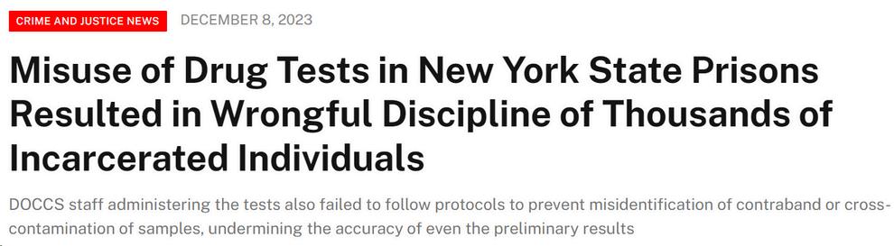 On November 30, 2022, New York State IG Lucy Lang released a report detailing defects in both the manufacturing and administration of drug tests used by the New York State Department of Corrections and Community Supervision (DOCCS) to detect the presence of contraband in correctional facilities that resulted in the disciplining of more than 2,000 incarcerated individuals across the state based upon unreliable evidence. These disciplinary sanctions included solitary confinement, delays in parole eligibility, and suspension of family visitation, among others.