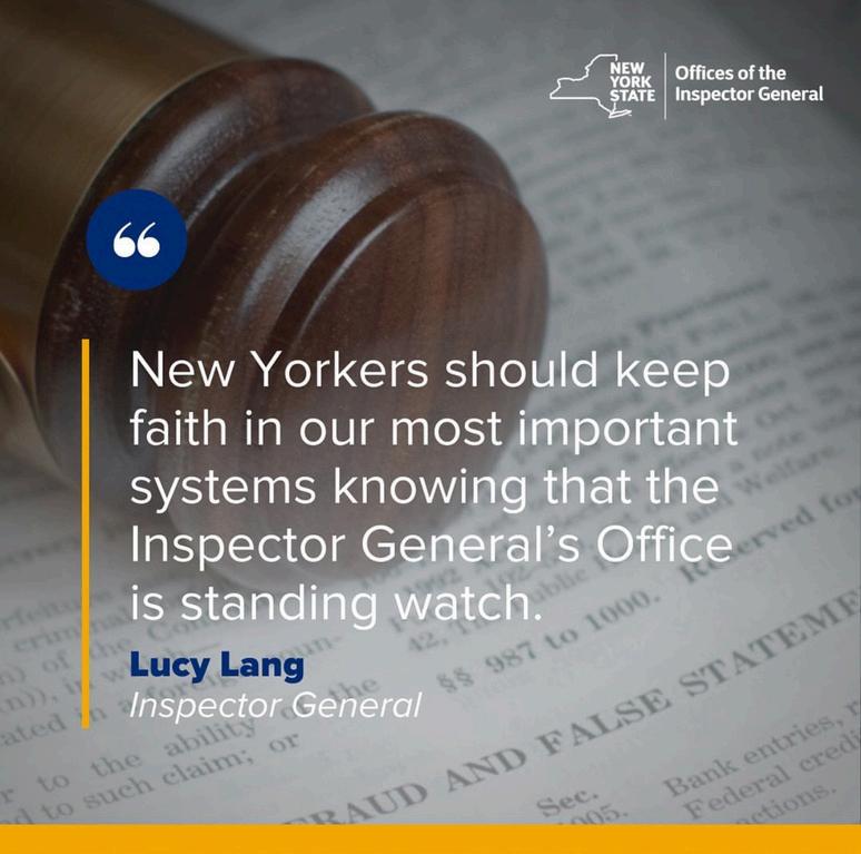 In 2022, former Inspector General of the Department of Defense and Department of Justice, Glenn Fine, published an article in about inspectors general titled “The Most Important Public Servants You’ve Never Heard Of ” In my own twoyear tenure as New York State Inspector General, my colleagues and I have worked diligently to change this well-worn adage about oversight agencies, and I am thrilled to share our successes in this biennial report