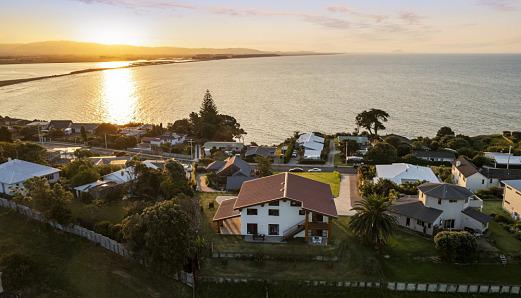 The contemporary glass and steel home enjoys elevation for a stunning panorama of the Bay of Plenty coastline, Pacific Ocean and islands. The gloriously glazed north facing frontage spans open plan living, an entertainer's kitchen flanked by dining and living spaces, plus, all the bedrooms. Open the doors to your outdoor environment when its warm. Hunker by the gas fire and admire the elements when the weather is inclement.