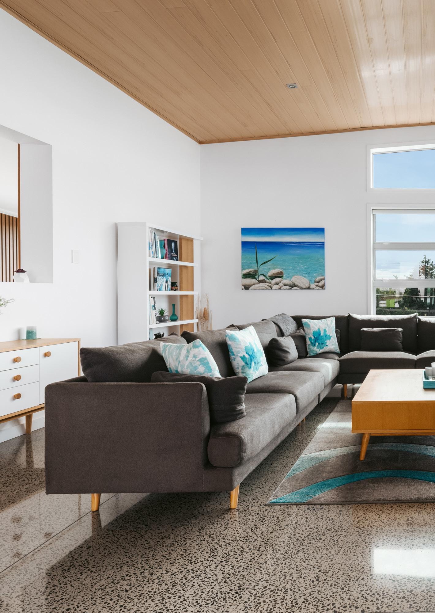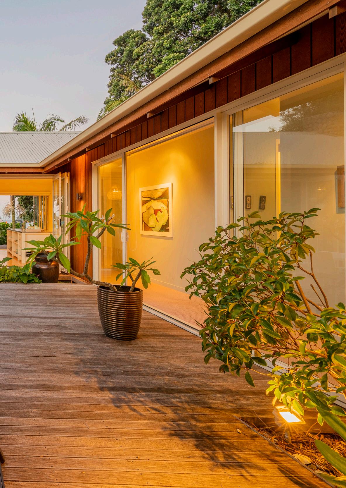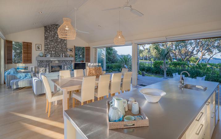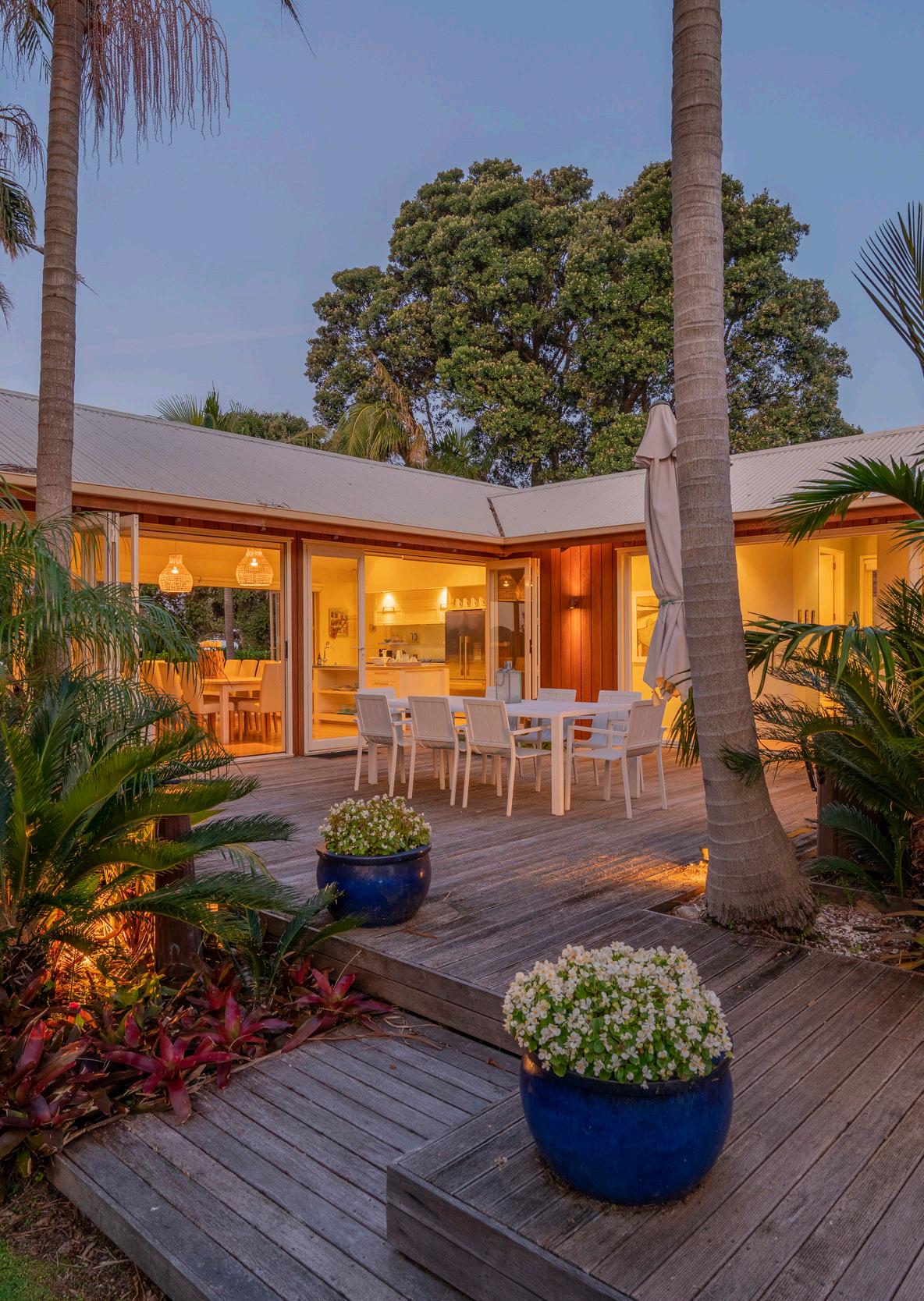Just a hop, skip and jump from the beach, the contemporary home has a relaxed coastal vibe, with a spacious open plan kitchen, dining and living area that opens on both sides to generous decks and garden. Lush sub-tropical plants surround the house and define the property boundaries The house wraps around a central outdoor living court, so every room can open its doors to the ocean air and summer breeze. A stunning stone fireplace will entice you to spend cosy winter weekends here as well.