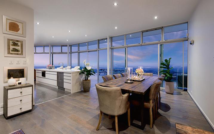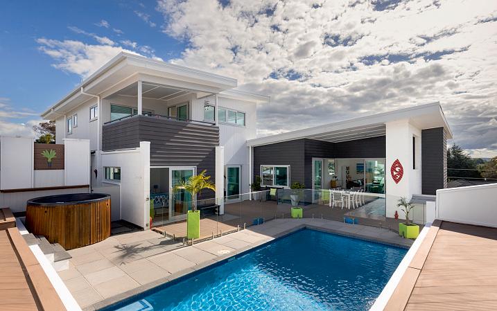 The mid level of the home is centred around the outdoor entertaining area with swimming pool and hot tub. Easy flow is maximised from the dual living spaces which are connected by the dining, kitchen, and butler's pantry.