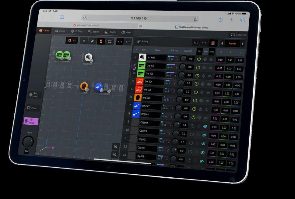 AFC Image editor software is available for Windows and MacOS, offering system configuration (loudspeaker placement, venue shape, zoning) and live control (object panning, 3D reverb editing, binaural).