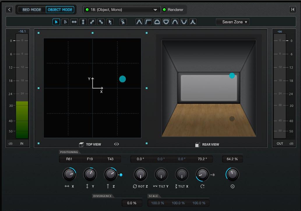 For object-based rendering, the user can convert the rectangular DAW or console panning/ rendering area to any geometric configuration from a basic cube to a 16-sided polygon, within which objects can be positioned. Three layers are available with heights that can be individually defined by the user.