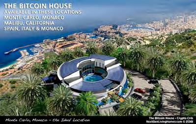 The Circular Bitcoin House is 26,192 Square Feet or 2,433 Square Meters–a three-level spectacular circular architectural design with three pool areas: a center pool surrounded by an all-glass wall interior for full protection from any wind elements to enjoy year-round, a unique 360 degree jet stream pool on the second level for drifting around the entire home with entry points from 9 individual bedrooms, and on the main level a half moon pool with two jacuzzies at each end for guests and for children having their own jacuzzi. The home can be configured with up to 17 bedrooms, and 20 bathrooms, plus two guest bathroom/powder rooms that can accommodate 3-4 people at a time. There are four grand Master Bedrooms on the third level, nine guest master bedrooms on the second level, and up to 4 bedrooms on the 1st level for staffing services for the home.