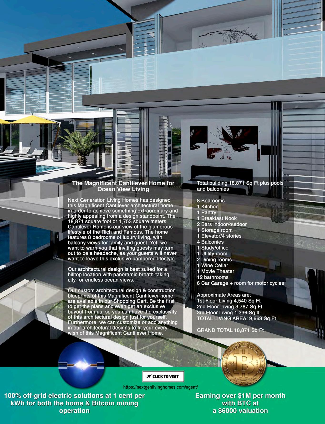 Next Generation Living Homes has designed this Magnificent Cantilever architectural home in order to achieve something extraordinary and highly appealing from a design standpoint. This is our view of the glamorous lifestyle of the Rich and Famous. This 18,871 sq. ft. Cantilever home features 8 bedrooms of luxury living, with balcony views for family and guest. All options listed in the Bitcoin House can be configured to the owners dream floor plan. Custom interiors with Italian marble and unique fixtures are designed just for this project.
