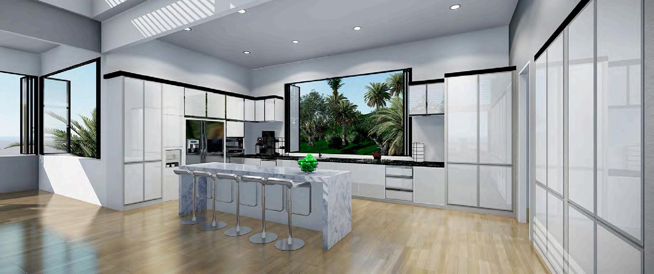 The home comes with a twelve-car underground garage equipped with all electric charging stations, a 20-foot ceiling for the main living area and entertainment area with full bar seating for five and open-air living with dramatic panoramic views. The home comes with two kitchens: one professional on the main level and one for breakfasts and fast lunches on the second level. The Kitchens are connected from the 1st floor to the 2nd floor with a butler smart elevator trolley for fast food delivery to the main dining areas. The home is equipped with both stairs and an elevator from garage to the top 3rd level. The home is designed with all -glass ceiling-to-floor Privacy Smartglass windows that turns opaque using electro-chromatic technology to