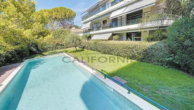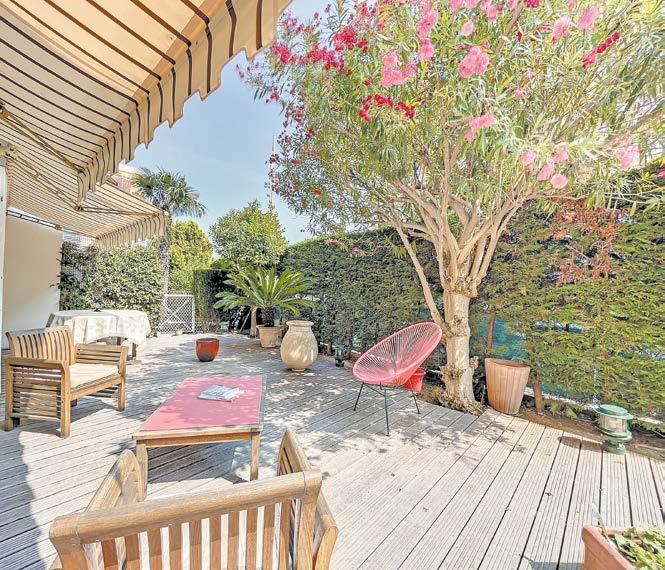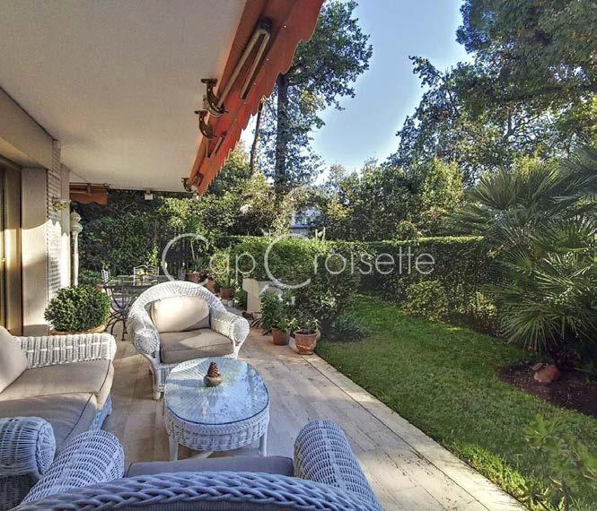 Arrière Croisette, 3 pièces en rez de jardin de 95,36 m² avec une terrasse en teck et jardin de 120 m². Hall d’entrée, un salon et salle à manger donnant sur la terrasse, une cuisine indépendante équipée, 2 grandes chambres, 2 salles de bains, 2 toilettes, un box et une cave. DPE: F. • Behind Croisette, 3-roomed garden apartment of 95,36 m² with a teak terrace and garden of 120 m². Entrance hall, lounge and dining room opening onto the terrace, separate fitted kitchen, 2 large bedrooms, 2 bathrooms, 2 toilets, garage and cellar. Mobile : 06.60.24.52.40