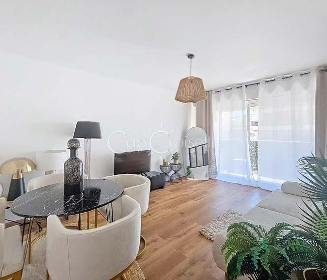 Au cœur de la Pointe Croisette beau 3 pièces traversant rénové de 70,50 m² avec terrasse de 11,45 m² et balcon de 6,65 m². Hall d’entrée, séjour, cuisine indépendante équipée, 2 chambres, dressing, 2 SDD et toilettes, parking extérieur. DPE: B. • In the heart of Pointe Croisette, beautiful renovated 3-room apartment of 70.50 m² with a 11.45 m² terrace and a 6.65 m² balcony. Entrance hall, living room, fully equipped independent kitchen, 2 bedrooms, walk-in closet, 2 bathrooms and toilets, outdoor parking. Mobile : 06.60.24.52.40